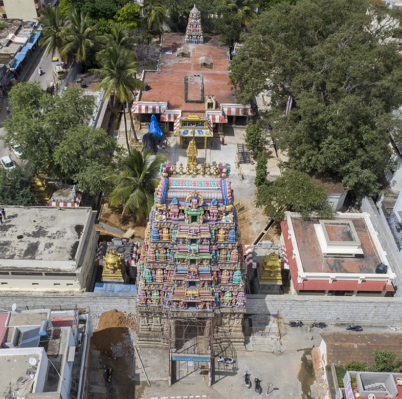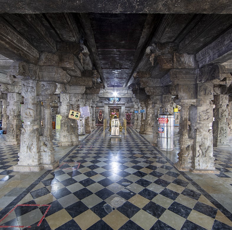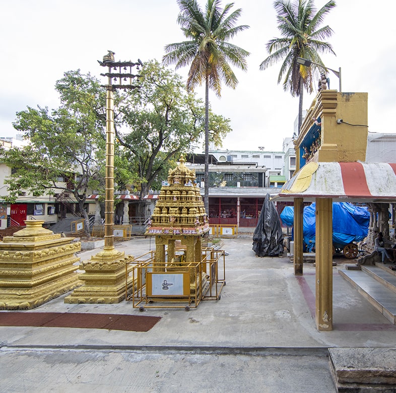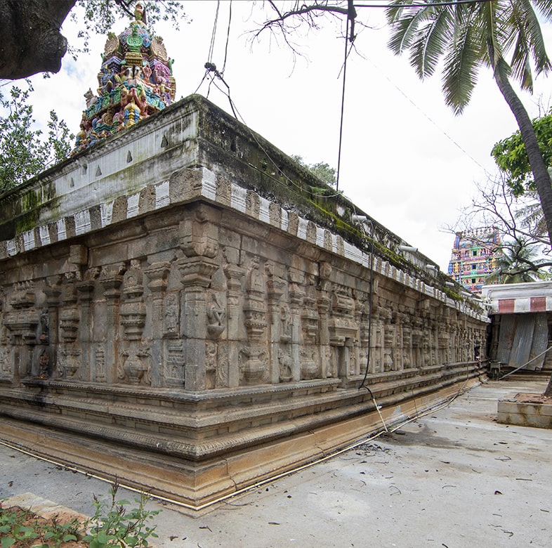 The Someshwara Temple stands within a large site that is accessed by a monumental gopura or temple gateway. The temple is placed along the central axis of the site. As you enter through the gopura, a few paces ahead are the bali peetha (sacrificial platform), deepa stambha (lamp pillar) and Nandi mandapa (Nandi pavilion). Beyond this, one steps into a spacious mandapa - a pillared hall that is open on three sides. On each side, a staircase flanked by yali balustrades leads us into the hall. A central doorway in the western end of the hall opens up into a pradakshina patha or circumambulatory path. The pradakshina wraps around the core spaces of the temple that comprise the navranga mandapa, the antarala (vestibule) and beyond that, the garbagriha (inner sanctum sanctorum) with its single celled shrine. The entire layout of the temple is based on the idea of progressively enhancing the sacredness of space. As you step through the gopura, you leave behind the mundane or merely material world. Each successive threshold or hallway then leads you into a more sanctified space until you reach the inner most sanctum, the most sacred space in the temple.