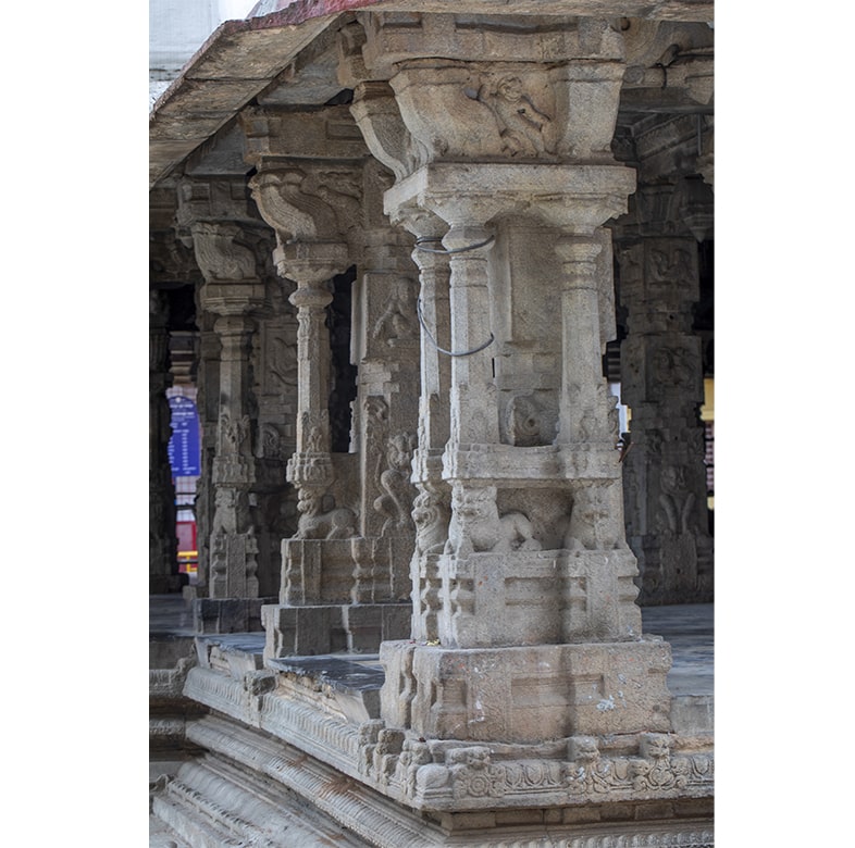 ಮಹಾ ಮಂಟಪವು ಸೂಕ್ಷ್ಮವಾದ ಕೆತ್ತನೆಗಳು/ಸೊಗಸಾದ ಕೆತ್ತನೆಗಳು ಮತ್ತು ಅಲಂಕಾರಗಳಿಂದ ತುಂಬಿದ್ದು, ಇದು ವಿಶೇಷವಾಗಿ 48 ಕಂಬಗಳ ಮೇಲೆ ಗೋಚರಿಸುತ್ತದೆ. ಈ ಸ್ತಂಭಗಳನ್ನು ಅವುಗಳ ಸಂರಚನೆಗೆ ಅನುಗುಣವಾಗಿ ವಿವಿಧ ಸಂಕೇತಗಳಾಗಿ ವರ್ಗೀಕರಿಸಬಹುದು. ಪ್ರಮಾಣಿತ ಸ್ತಂಭವು ಬಹುಭುಜಾಕೃತಿಯ ದಿಂಡು ಆಗಿದ್ದು, ಮೂರು ಚದರ ವಿಭಾಗಳಾಗಿ ವಿಭಜಿಸಲ್ಪಟ್ಟಿದ್ದು, ಪ್ರತಿಯೊಂದೂ ದೇವರುಗಳು, ಪ್ರಾಣಿಗಳು, ಆಕಾಶಗಳು ಮತ್ತು ಸಾಮಾನ್ಯ ಜನರ ಶಿಲ್ಪಗಳಿಂದಲೂ ಸಮೃದ್ಧವಾಗಿ ಕೆತ್ತಲಾಗಿದೆ. ಕೇಂದ್ರ ಅಂಕಣಗಳ ಹಾಗೂ ಪರಿಧಿಯ ಉದ್ದಕ್ಕೂ, ಸ್ಥಂಭಗಳಲ್ಲಿ ತೆಳ್ಳಗಿನ ಕೊಲೊನೆಟ್ /ಕಂಭವನ್ನು ಪರಿಚಯಿಸಲಾಗಿದೆ. ಈ ಕೊಲೊನೆಟ್‌ಗಳು ಸ್ತಂಭದ ವ್ಯಾಪ್ತಿಯನ್ನು ವಿಸ್ತರಿಸುವ ಮತ್ತು ಆಳವಾದ ಮುಂಚಾಚಿಗೆ ಅನುವು ಮಾಡಿಕೊಡುವ ಎರಡೂ ಉದ್ದೇಶವನ್ನು ಪೂರೈಸುತ್ತವೆ. ವಿಶೇಷವಾಗಿ ಕೇಂದ್ರ ಅಂಕಣದಲ್ಲಿ, ಕಾಣುವ ಒಟ್ಟಾರೆ ನೋಟವನ್ನು ಕೊಲೊನೆಟ್‌ಗಳು ತೆಳ್ಳಗೆ ಇಡುತ್ತವೆ, ಹಾಗಾಗಿ ಲಘುತ್ವದ ಭಾವಕ್ಕೆ ತನ್ನ ಕೊಡುಗೆಯನ್ನು ನೀಡುತ್ತವೆ. ತನ್ನ ಪೂರ್ವ ದ್ವಾರದ ಕಡೆಗೆ ಮಂಟಪ ಚಾಚಿಕೊಂಡಿರುವ ಕಡೆಯಲ್ಲಿ ಕೋನಾಕಾರದ ಕಲೋನೆಟ್ ಹೊಂದಿರುವ ಕಂಬವು ಇದೆ. ಮೂರು ಪ್ರವೇಶ ಮೆಟ್ಟಿಲುಗಳ ಇಕ್ಕೆಲೆಗಳಲ್ಲಿ ಯಾಳಿಗಳನ್ನು ಹೊಂದಿರುವ ಕಂಬಗಳು ಇವೆ.