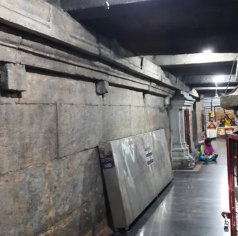 ದೇವಾಲಯದ ಗೋಡೆಗಳನ್ನು ಸಂಸ್ಕರಣೆಯಾದ ಕಲ್ಲು ಕೆಲಸವನ್ನುಬಳಸಿ, ಗಾರೆಯೊಂದಿಗೆ ನಿರ್ಮಿಸಲಾಗಿದೆ. ಈ ಪ್ರದೇಶದಲ್ಲಿ, ಇದೇ ಅವಧಿಯಲ್ಲಿ ನಿರ್ಮಿಸಲಾದ ದೇವಾಲಯಗಳಲ್ಲಿ ಸಾಮಾನ್ಯವಾಗಿ ಕಂಡುಬರುವಂತೆ, ಇಲ್ಲೂ ಎರಡು ಗೋಡೆಯ ವ್ಯವಸ್ಥೆಯನ್ನು ಅನುಸರಿಸಲಾಗಿದೆ. ಗೋಡೆಯು ಕಲ್ಲಿನ ಎರಡು ಪದರಗಳನ್ನು ಒಳಗೊಂಡಿದ್ದು, ಅವುಗಳ ನಡುವೆ ಒಂದು ಕುಳಿಯು ಕಲ್ಲುಮಣ್ಣುಗಳಿಂದ ತುಂಬಿರುತ್ತದೆ - ಇದರಿಂದಾಗಿ ಗೋಡೆಯು ಸ್ಯಾಂಡ್ವಿಚ್ ಅನ್ನು ಹೋಲುತ್ತದೆ. ಗೋಡೆಯ ದಪ್ಪವು ಕೆಲವು ಸ್ಥಳಗಳಲ್ಲಿ 60 ಸೆಂ.ಮೀ ನಿಂದ ಒಂದು ಮೀಟರ್ ದಪ್ಪದವರೆಗೆ ಇರುತ್ತದೆ. ಗೋಡೆಯ ಮೇಲ್ಮೈಗಳ ಉದ್ದಕ್ಕೂ, ಕಚ್ಚಾ ಕಲ್ಲಿನ ತುಂಡುಗಳು ನಿಯಮಿತ ಅಂತರದಲ್ಲಿ ಚಾಚಿಕೊಂಡಿರುವದನ್ನು ನೋಡಬಹುದು. ಈ ದೊಡ್ಡ ಕಲ್ಲುಗಳನ್ನು ಥ್ರೂ-ಸ್ಟೋನ್ಸ್ ಅಥವಾ ಬಾಂಡ್ ಸ್ಟೋನ್ಸ್ ಎಂದು ಕರೆಯಲಾಗುತ್ತದೆ. ಅವು ಗೋಡೆಯ ಸಂಪೂರ್ಣ ಅಗಲವನ್ನು ವ್ಯಾಪಿಸಿ, ಗೋಡೆಗಳ ಎರಡು ಪದರಗಳನ್ನು ರಚನಾತ್ಮಕವಾಗಿ ಬಿಗಿದಿಡಲು ನೆರವಾಗುತ್ತದೆ. ನೀವು ಪ್ರದಕ್ಷಿಣಾ ಪಥದಲ್ಲಿ ನಡೆಯುವಾಗ, ಎರಡು ಅಡ್ಡತೊಲೆಗಳ ಛೇದನದಲ್ಲಿ ಬಂಧದ ಕಲ್ಲುಗಳನ್ನು ಸೂಕ್ಷ್ಮವಾಗಿ ಇರಿಸಿರುವುದನ್ನೂ, ಅದರಿಂದ ಕಲ್ಲಿನ ಗೋಡೆಗಳ ಮೇಲೆ ಭಾರವನ್ನು ಪರಿಣಾಮಕಾರಿಯಾಗಿ ವರ್ಗಾಯಿಸಲು ಅನುವು ಮಾಡಿಕೊಟ್ಟಿರುವುದನ್ನೂ ಗಮನಿಸಿ. ಮುಖ್ಯ ದೇಗುಲದ ಉತ್ತರಕ್ಕೆ, ಹಳೆಯ ದೇವಾಲಯದ ಆವರಣದ ಗೋಡೆಯ ಸಣ್ಣ ಭಾಗದ ಮೇಲೆ ಈ ಥ್ರೂ-ಸ್ಟೋನ್ಸ್ ಗೋಚರಿಸುತ್ತವೆ.