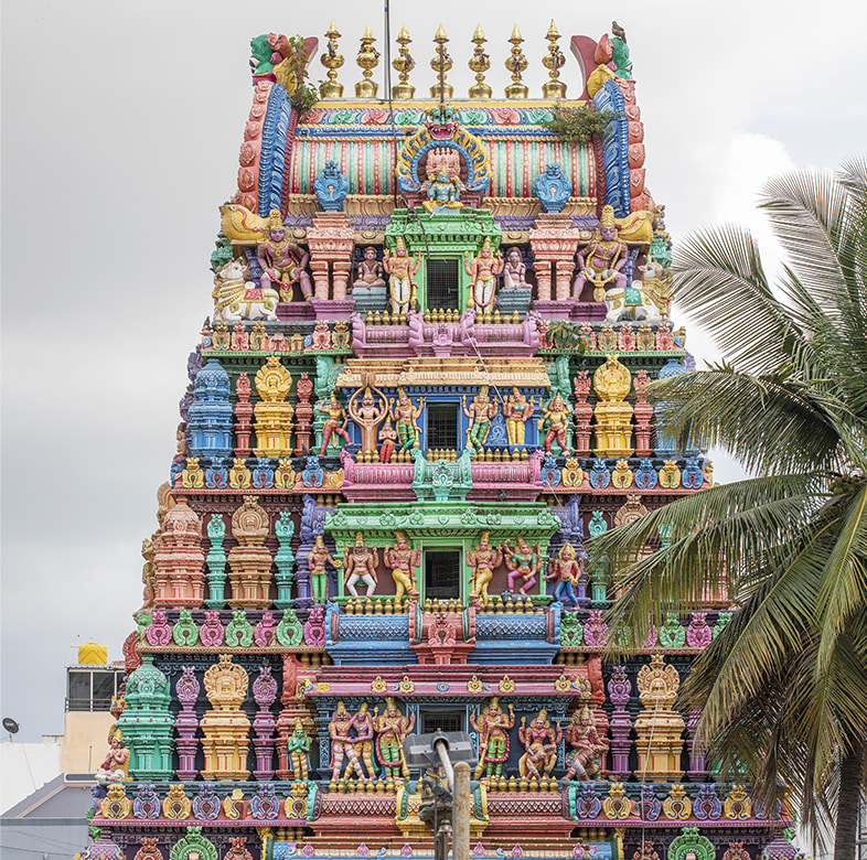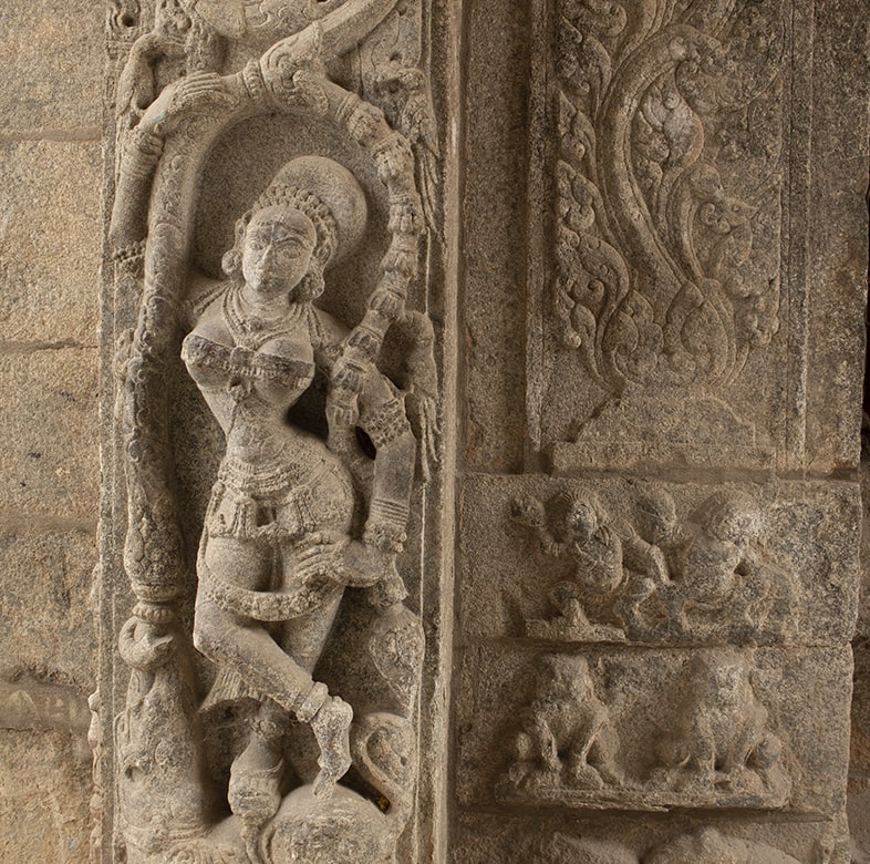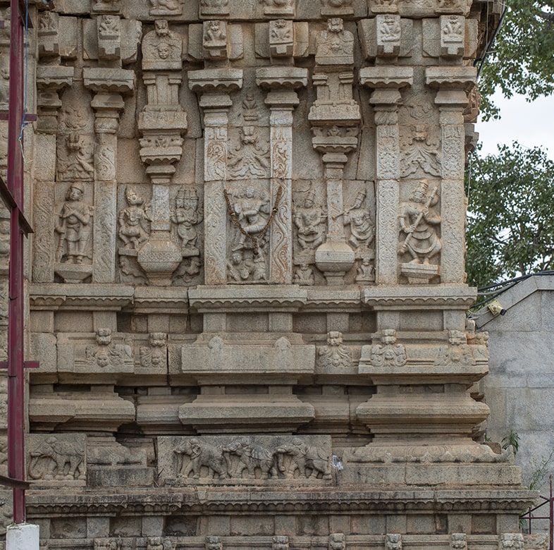 The entrance to the Someshwara Temple is dominated by the imposing tower of the gopura, standing at a staggering height of 22m. This entrance gateway, measuring 12 m by 9 m at the base, has a lower half of stone and an upper half constructed with brick and stone, adorned with figures carved in stucco. This upper portion comprises five storeys of diminishing floors and topped by a shala or barrel-vaulted roof and with gilded kalasha finials. The intermediate levels are of madras terraces, constructed using up to 6 layers of brick. The overall scheme is typical of Vijayanagara period gopuras which were themselves derived from Chola prototypes of the 11th and 12th centuries. Symbolically, the gopura is important as it marks the devotee’s entry into the sacred realm from the non-sacred outside world.