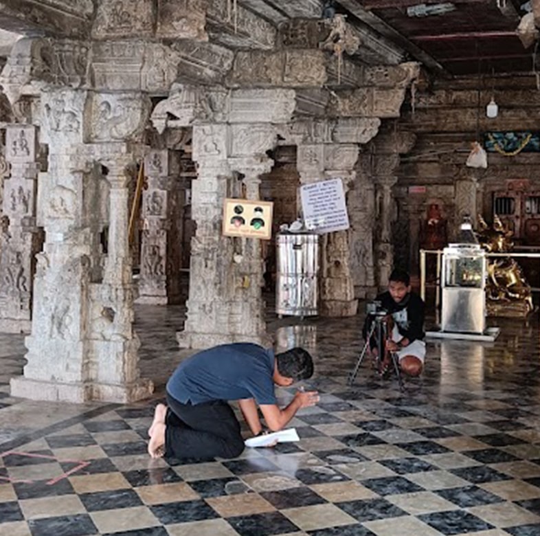 Photogrammetry is a process by which large number of still photographs of an object or environment are combined to create a precise and navigable 3D model. This technique is useful in documenting heritage sites like the Someshwara Temple, which have a high level of sculptural detail and inaccessible areas like tall gopuras and vimanas. While manual methods were used to get the basic measurements and distances of the floor plans, photogrammetry was used here to achieve scale-rectified orthogonal images of the sculptural panels and other elements where access was impeded. Both the methods were later referenced against each other to ensure accuracy of the drawings.