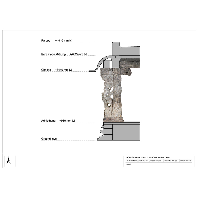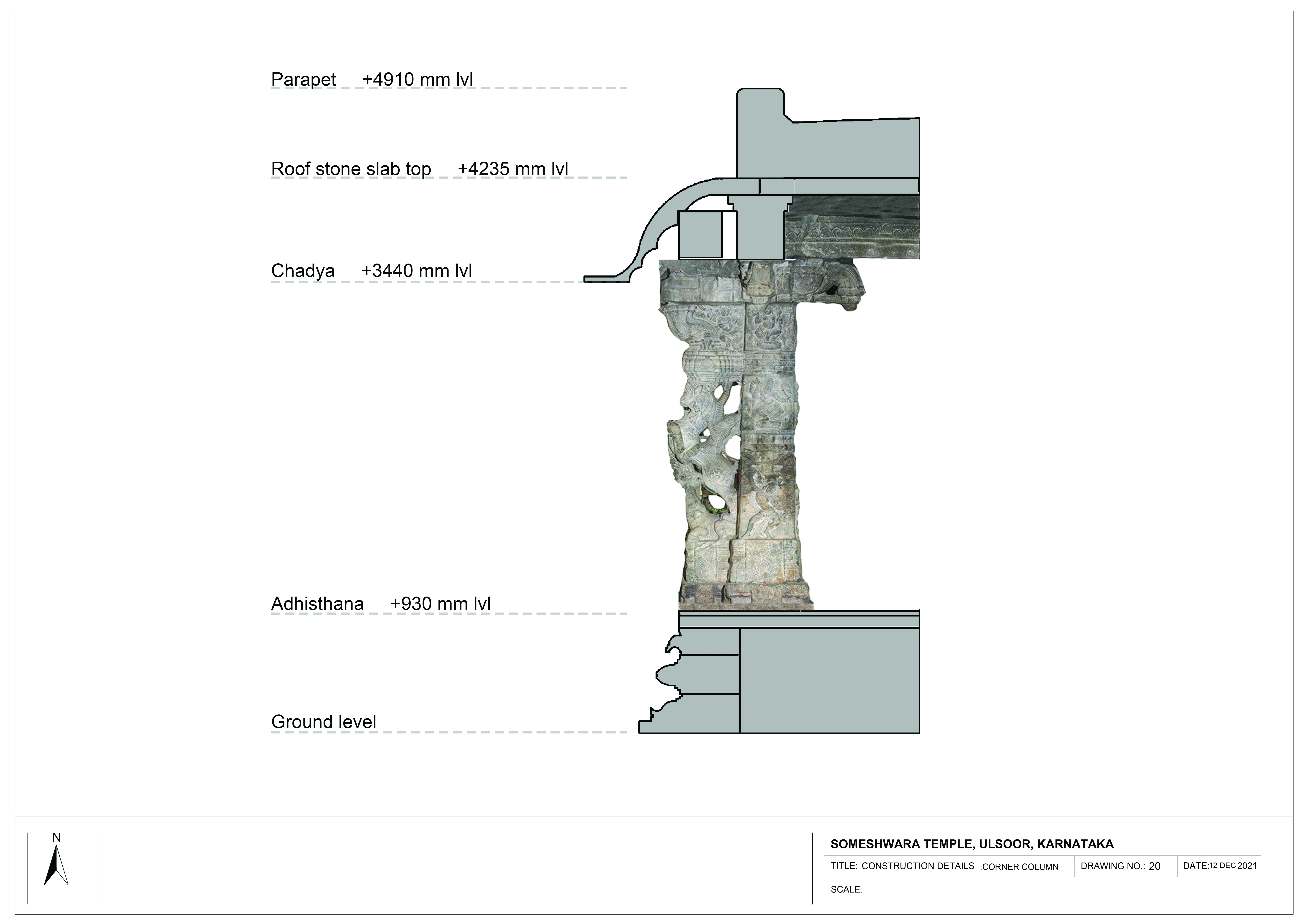 ದೇಗುಲದ ಸಮಗ್ರ ದಾಖಲಾತಿಯಾಗಿ ಪರಿಣಮಿಸುವಲ್ಲಿ, ವಿವಿಧ ಕಂಬಗಳ ಮಾದರಿಗಳು, ಪ್ರತಿಬಿಂಬಿತ ಒಳಮಾಳಿಗೆ/ಛಾವಣಿ ಮಾದರಿಗಳು, ಕಂಬದ ಪೀಠ/ಮೇಲುಪಾಯದ ವಿವರಗಳು ಹಾಗೂ ಇತರ ಅಂಶಗಳನ್ನು ದಾಖಲಿಸಲಾಯಿತು.