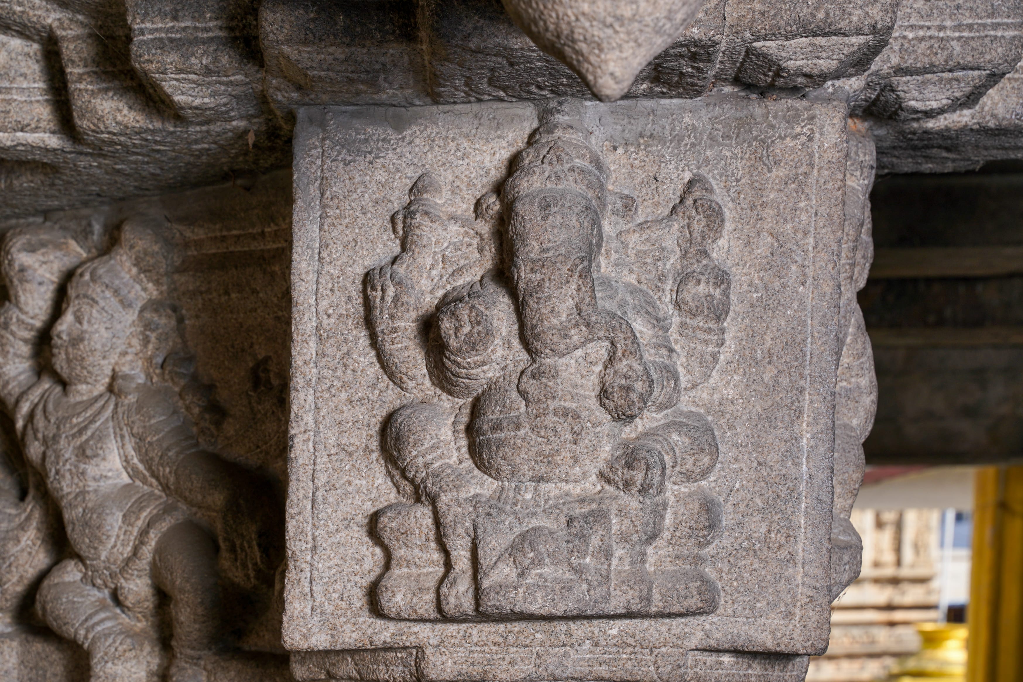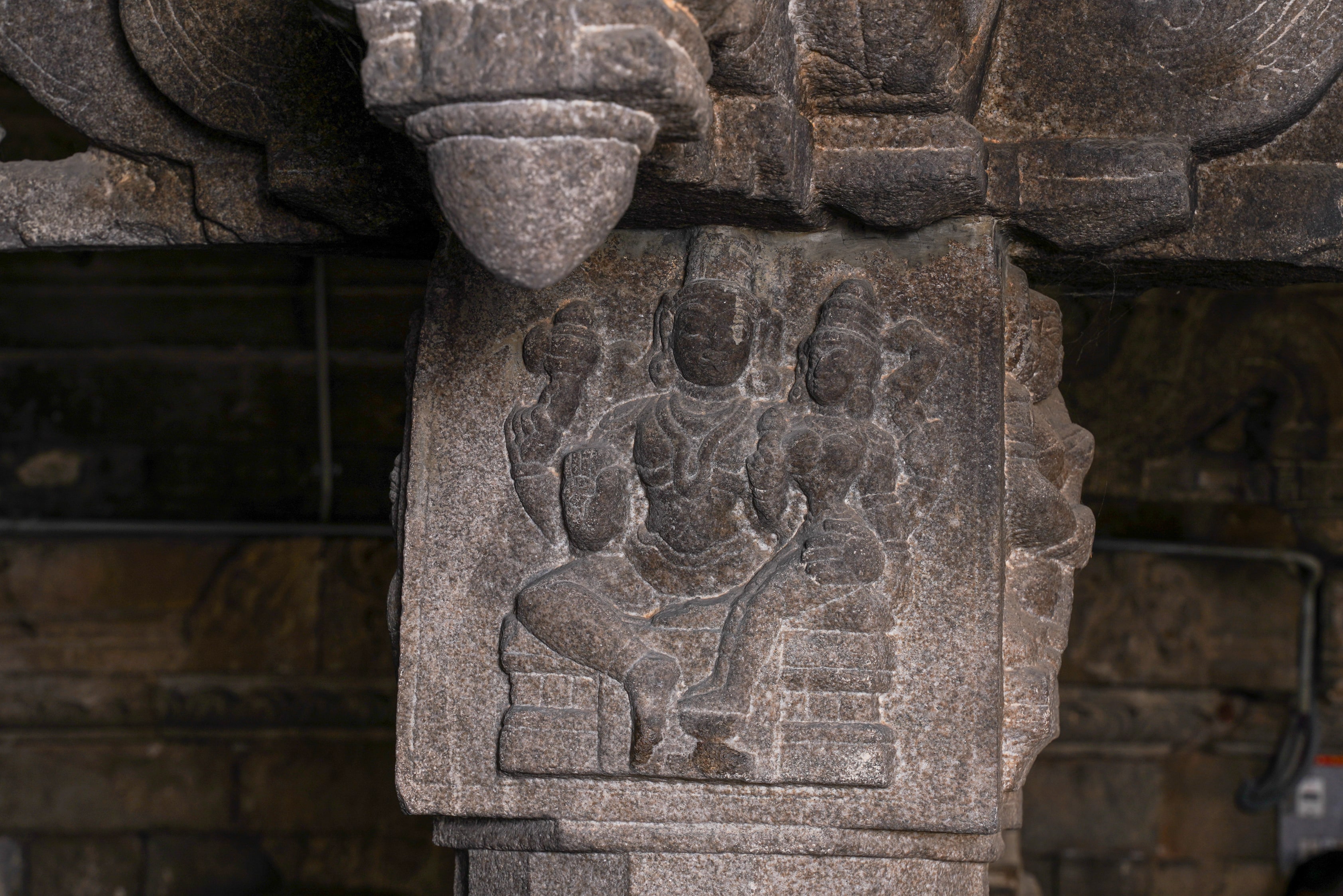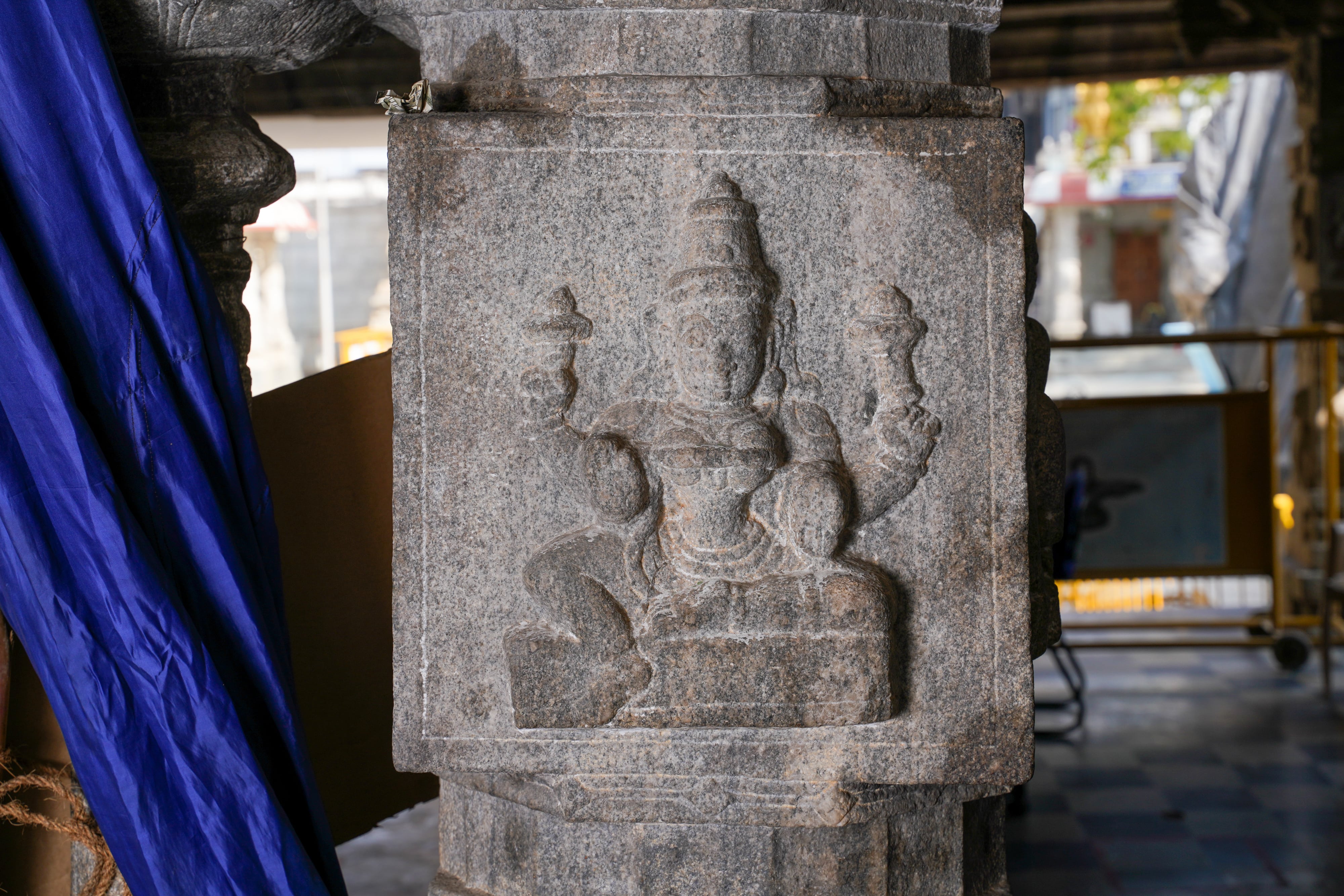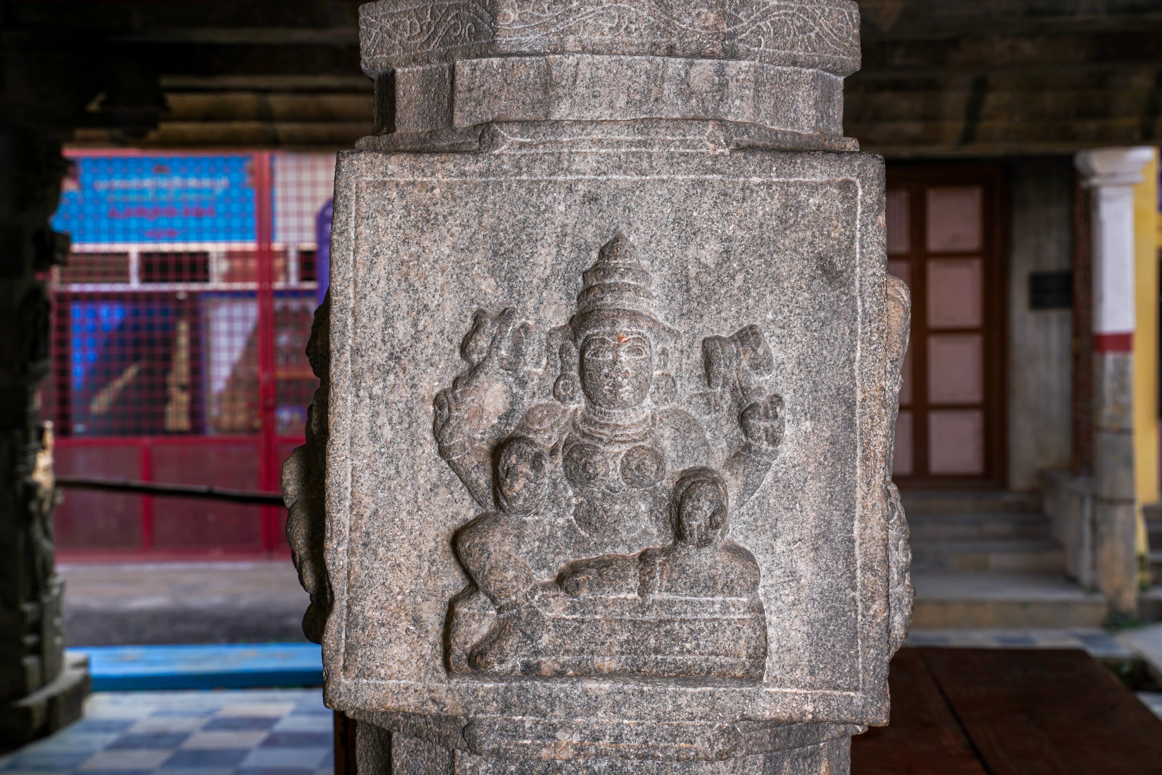 ಪವಿತ್ರವಾದ ಶ್ರೀಚಕ್ರದ ಹಿಂದೆ ಕಲ್ಲಿನ ಲಿಂಗ ಮತ್ತು ಕಾಮಾಕ್ಷಿಯ ಆಕರ್ಷಕವಾದ ಕಲ್ಲಿನ ಪ್ರತಿಮೆಗಳು ದೇವಾಲಯ ಸಂಕೀರ್ಣದ ಎರಡು ಮುಖ್ಯ ದೇವಾಲಯಗಳಲ್ಲಿ ಸ್ಥಾಪಿತವಾಗಿದೆ. ಈ ದೇವಾಲಯವು ಉಪದೇವತೆಗಳು, ಲಿಂಗಗಳು, ಹನುಮಾನ್ ಮತ್ತು ನವಗ್ರಹ ಸಮೂಹದೊಂದಿಗೆ ಹಲವಾರು ಉಪಮಂದಿರಗಳನ್ನು ಹೊಂದಿದೆ. ಉತ್ಸವಗಳಿಗೆಂದು ತೆಗೆದುಕೊಂಡು ಹೋಗುವ ಕಂಚಿನ ಮೆರವಣಿಗೆಯ ದೇವತೆಗಳು ಮತ್ತು ಹಿತ್ತಾಳೆಯ ಕವಚಗಳ ಸಣ್ಣ, ಹೊಳೆಯುವ ಸಂಗ್ರಹವನ್ನು ಗರ್ಭಗುಡಿಯ ಪಕ್ಕದ ಕೋಣೆಯಲ್ಲಿ ಸಂಗ್ರಹಿಸಲಾಗಿದೆ. ಶಿವ, ಪಾರ್ವತಿ, ವಿಷ್ಣು, ಲಕ್ಷ್ಮಿ ಮತ್ತು ಗಣೇಶನ ಹಲವಾರು ಸ್ವರೂಪಗಳ ಉಬ್ಬು ಶಿಲ್ಪಗಳು ದೇವಾಲಯದ ಮಂಟಪದ ಕಂಭಗಳು, ಗೋಡೆಗಳು, ಗೋಪುರ ಮತ್ತು ವಿಮಾನಗಳನ್ನು ಅಲಂಕರಿಸಿವೆ. ಶಿವನು, ನರ್ತಿಸುವ ನಟರಾಜ, ಉಗ್ರ ವೀರಭದ್ರ, ಇಂದ್ರಿಯಾತೀತ ಮೃತ್ಯುಂಜಯ ಮತ್ತು ಆಕರ್ಷಕ ವಿವಾಹಿತ ಉಮಾಸಹಿತ ಶಿವನಾಗಿ ಕಾಣಿಸಿಕೊಳ್ಳುತ್ತಾನೆ. ಬೆಣ್ಣೆ ಕದಿಯುತ್ತಿರುವ ಬಾಲಕೃಷ್ಣ, ಕಾಳಿಂಗ ಸರ್ಪದೊಂದಿಗೆ ಸೆಣೆಸಾಟ, ಗೋವರ್ಧನ ಗಿರಿಯನ್ನು ಎತ್ತುವುದನ್ನು ಚಿತ್ರಿಸುವ ಶಿಲ್ಪಗಳು ಶಿಲ್ಪಿಗಳ ಅಚ್ಚುಮೆಚ್ಚಿನ ವಸ್ತುವಿಷಯವಾಗಿದೆ.