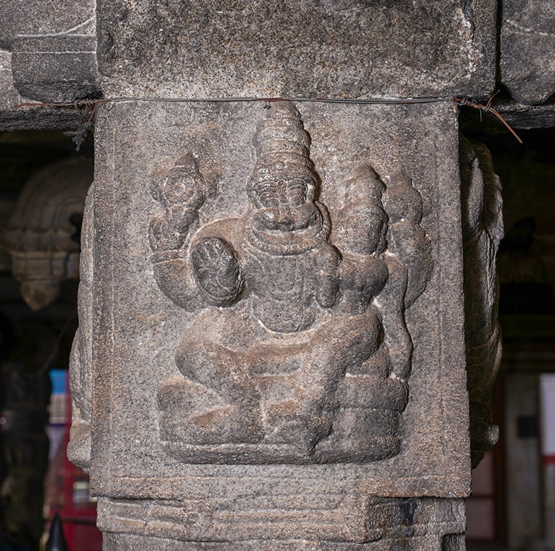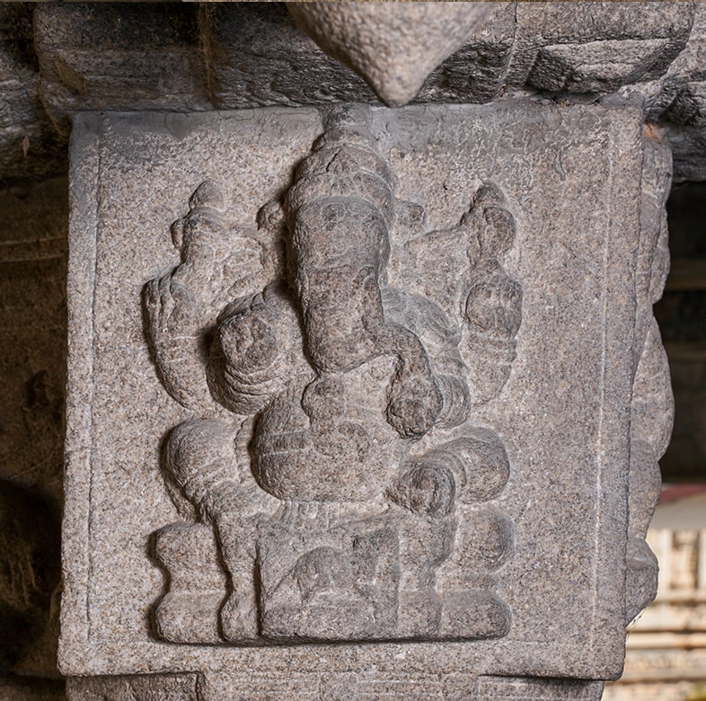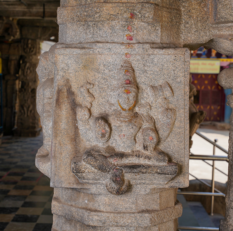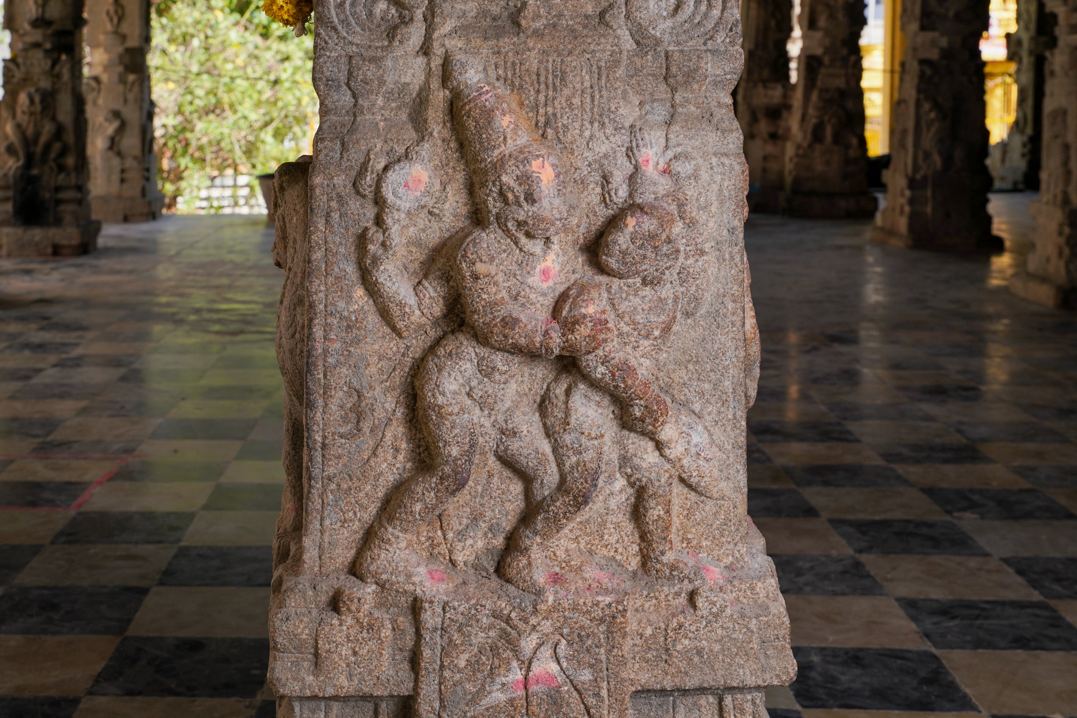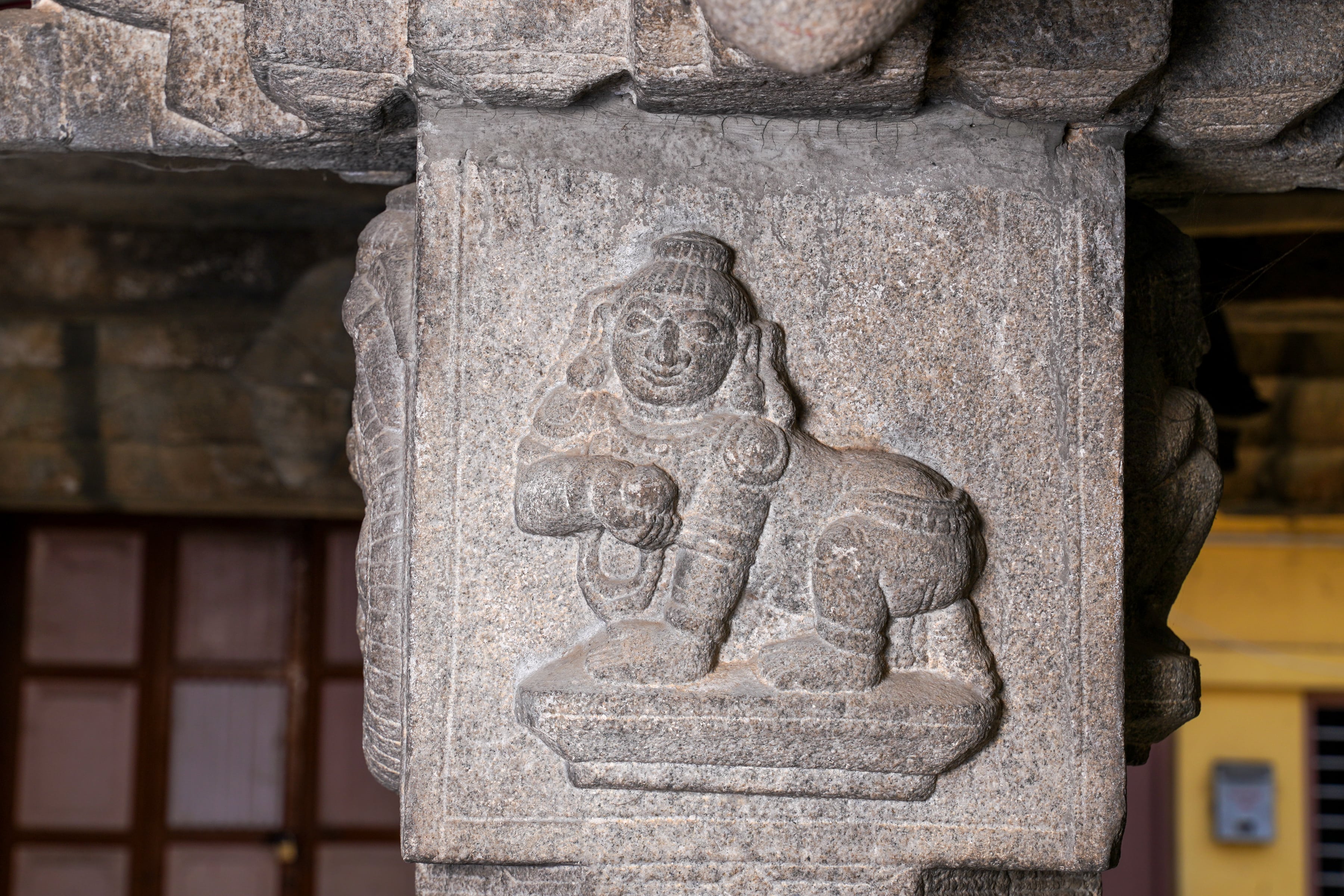 ಪವಿತ್ರವಾದ ಶ್ರೀಚಕ್ರದ ಹಿಂದೆ ಕಲ್ಲಿನ ಲಿಂಗ ಮತ್ತು ಕಾಮಾಕ್ಷಿಯ ಆಕರ್ಷಕವಾದ ಕಲ್ಲಿನ ಪ್ರತಿಮೆಗಳು ದೇವಾಲಯ ಸಂಕೀರ್ಣದ ಎರಡು ಮುಖ್ಯ ದೇವಾಲಯಗಳಲ್ಲಿ ಸ್ಥಾಪಿತವಾಗಿದೆ. ಈ ದೇವಾಲಯವು ಉಪದೇವತೆಗಳು, ಲಿಂಗಗಳು, ಹನುಮಾನ್ ಮತ್ತು ನವಗ್ರಹ ಸಮೂಹದೊಂದಿಗೆ ಹಲವಾರು ಉಪಮಂದಿರಗಳನ್ನು ಹೊಂದಿದೆ. ಉತ್ಸವಗಳಿಗೆಂದು ತೆಗೆದುಕೊಂಡು ಹೋಗುವ ಕಂಚಿನ ಮೆರವಣಿಗೆಯ ದೇವತೆಗಳು ಮತ್ತು ಹಿತ್ತಾಳೆಯ ಕವಚಗಳ ಸಣ್ಣ, ಹೊಳೆಯುವ ಸಂಗ್ರಹವನ್ನು ಗರ್ಭಗುಡಿಯ ಪಕ್ಕದ ಕೋಣೆಯಲ್ಲಿ ಸಂಗ್ರಹಿಸಲಾಗಿದೆ. ಶಿವ, ಪಾರ್ವತಿ, ವಿಷ್ಣು, ಲಕ್ಷ್ಮಿ ಮತ್ತು ಗಣೇಶನ ಹಲವಾರು ಸ್ವರೂಪಗಳ ಉಬ್ಬು ಶಿಲ್ಪಗಳು ದೇವಾಲಯದ ಮಂಟಪದ ಕಂಭಗಳು, ಗೋಡೆಗಳು, ಗೋಪುರ ಮತ್ತು ವಿಮಾನಗಳನ್ನು ಅಲಂಕರಿಸಿವೆ. ಶಿವನು, ನರ್ತಿಸುವ ನಟರಾಜ, ಉಗ್ರ ವೀರಭದ್ರ, ಇಂದ್ರಿಯಾತೀತ ಮೃತ್ಯುಂಜಯ ಮತ್ತು ಆಕರ್ಷಕ ವಿವಾಹಿತ ಉಮಾಸಹಿತ ಶಿವನಾಗಿ ಕಾಣಿಸಿಕೊಳ್ಳುತ್ತಾನೆ. ಬೆಣ್ಣೆ ಕದಿಯುತ್ತಿರುವ ಬಾಲಕೃಷ್ಣ, ಕಾಳಿಂಗ ಸರ್ಪದೊಂದಿಗೆ ಸೆಣೆಸಾಟ, ಗೋವರ್ಧನ ಗಿರಿಯನ್ನು ಎತ್ತುವುದನ್ನು ಚಿತ್ರಿಸುವ ಶಿಲ್ಪಗಳು ಶಿಲ್ಪಿಗಳ ಅಚ್ಚುಮೆಚ್ಚಿನ ವಸ್ತುವಿಷಯವಾಗಿದೆ.