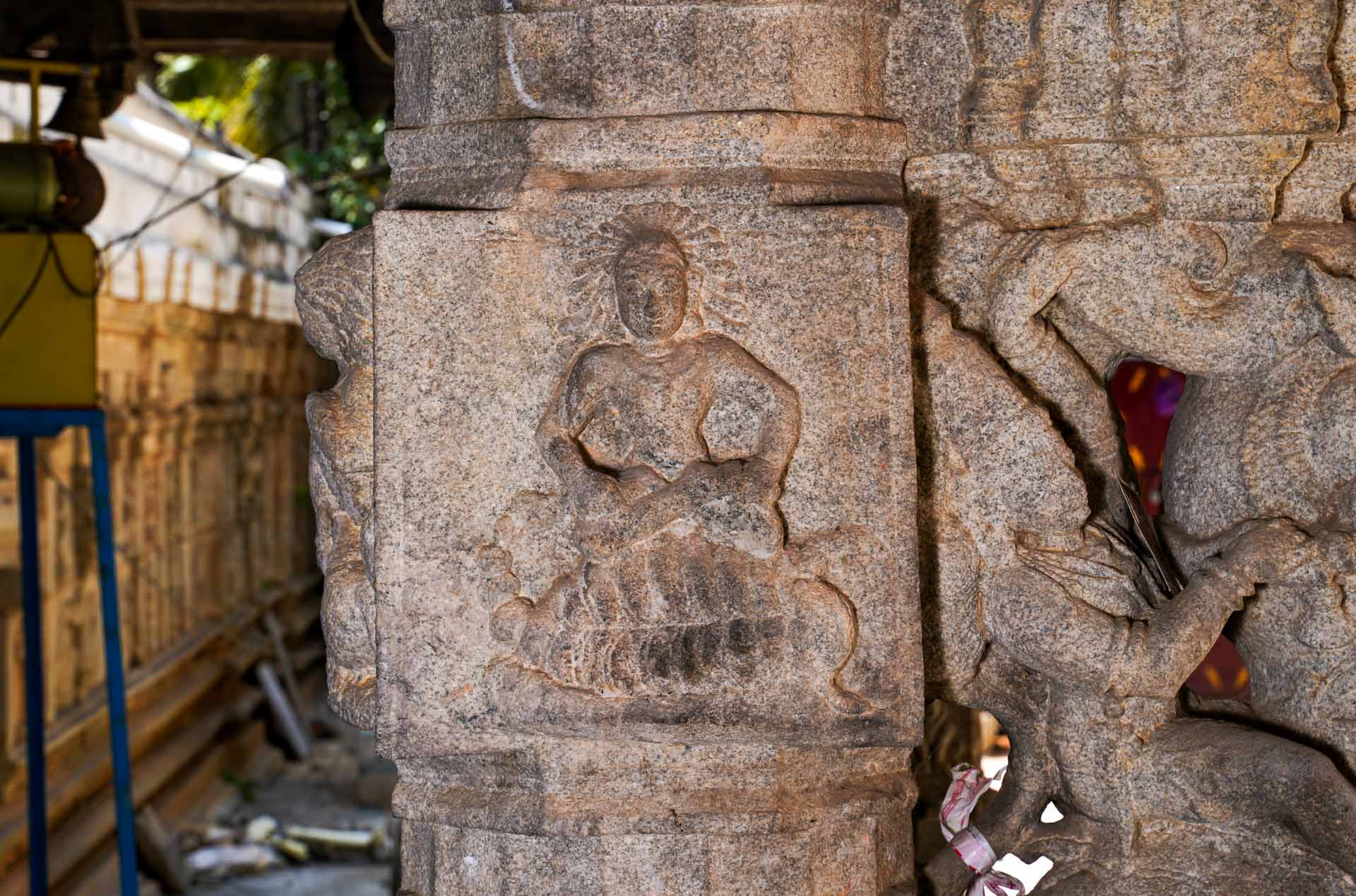 ಮಂಟಪದ ಒಂದು ಕಂಭದ ಮೇಲೆ ಚೇಳಿನ ಮೇಲೆ ಕುಳಿತಿರುವ ನಾಥನ. ಜೀವಂತವಾಗಿ ಕಾಣುವ/ ಜೀವಕಳೆಯಿಂದ ತುಂಬಿದ ರತ್ನದಂತಹ ಮಧ್ಯದ ಉಬ್ಬು ಶಿಲ್ಪವಿದೆ.