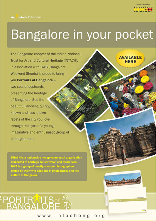 On World Heritage Day 2009, INTACH Bangalore, together with Bangalore Weekend Shoots, released Portraits of Bangalore - two sets of 8 postcards that showcase the natural and architectural heritage of Bangalore, as seen through the eyes of some truly gifted amateur photographers. These are available at large booksellers and also through the Chapter. The response has been encouraging and future plans include a set of sketches of Bangalore's heritage assets.