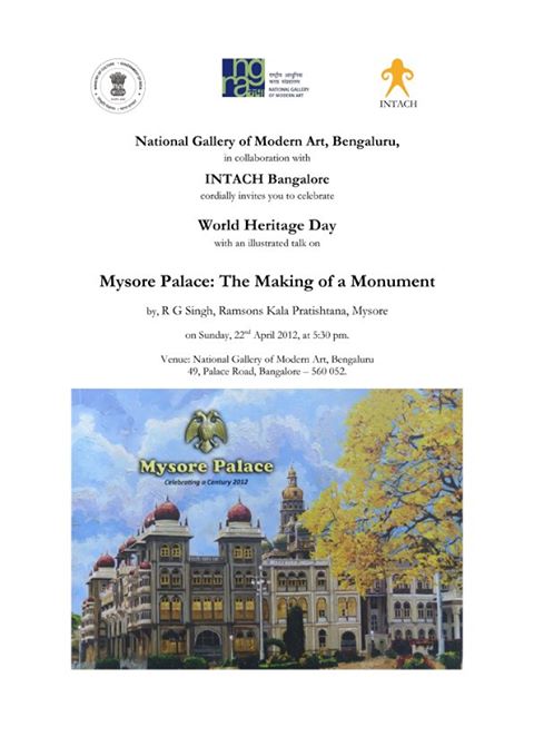 INTACH Bangalore partnered with NGMA (The National Gallery of Modern Art) Bengaluru, for the second consecutive year to celebrate World Heritage Day 2012. The event was an illustrated talk titled 'Mysore Palace: The Making of a Monument.' The timing was apt – the centenary year of the Mysore Palace. And the speaker RG Singh of Ramsons Kala Pratishtana, a Mysore based art foundation, had earlier released a journal with rare archival photos of the rebuilding of the palace. RG brought the story alive for the audience with his collection of never before seen photographs.