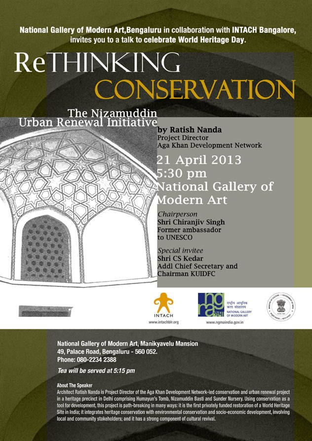 INTACH Bangalore, in collaboration with the National Gallery of Modern Art, Bengaluru, celebrated World Heritage Day 2013 with a talk on a unique conservation project – The Nizamuddin Urban Renewal Initiative.