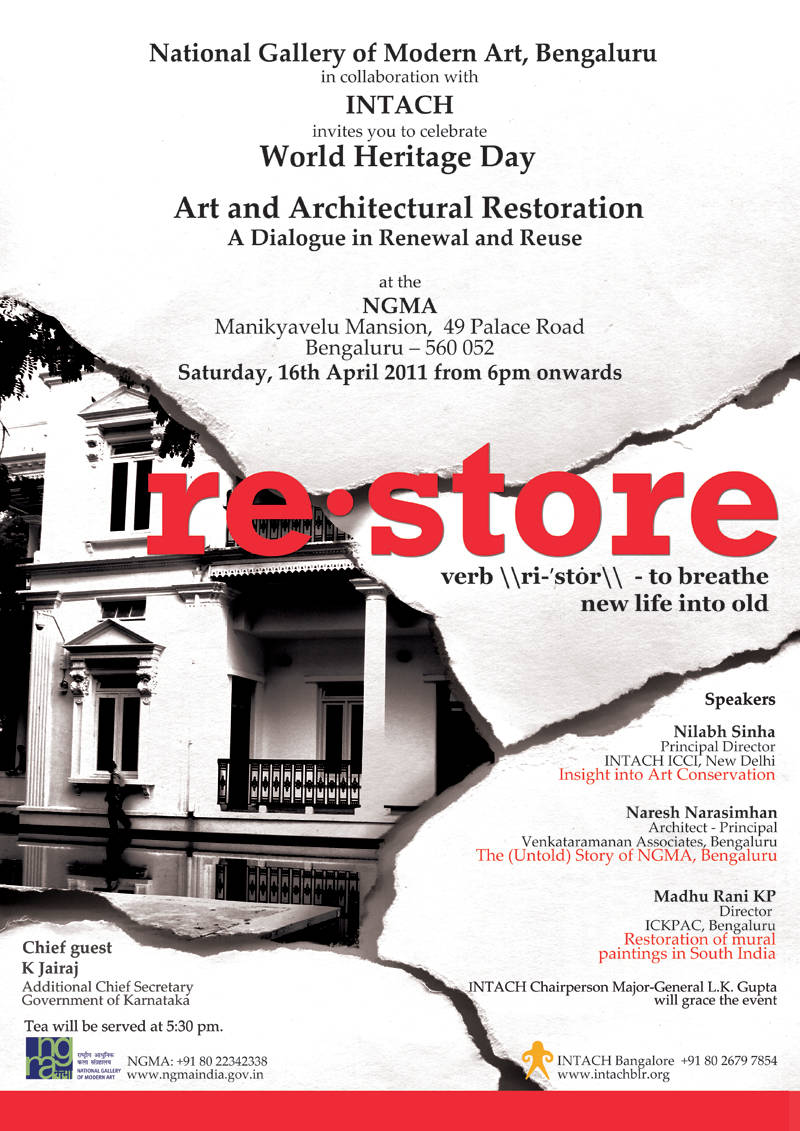 Chief Guest, Mr K Jairaj, Additional Chief Secretary, Government of Karnataka, and INTACH Chairman, Major General L K Gupta, spoke on the need for all stakeholders to invest in the care of 'unprotected' heritage. Ms Shoba Nambisan, Director, NGMA felt the shortage of art restorers despite an art conservation lab in the gallery. INTACH Karnataka State Convenor, Mr Asvathanarayan was also present at the event.
