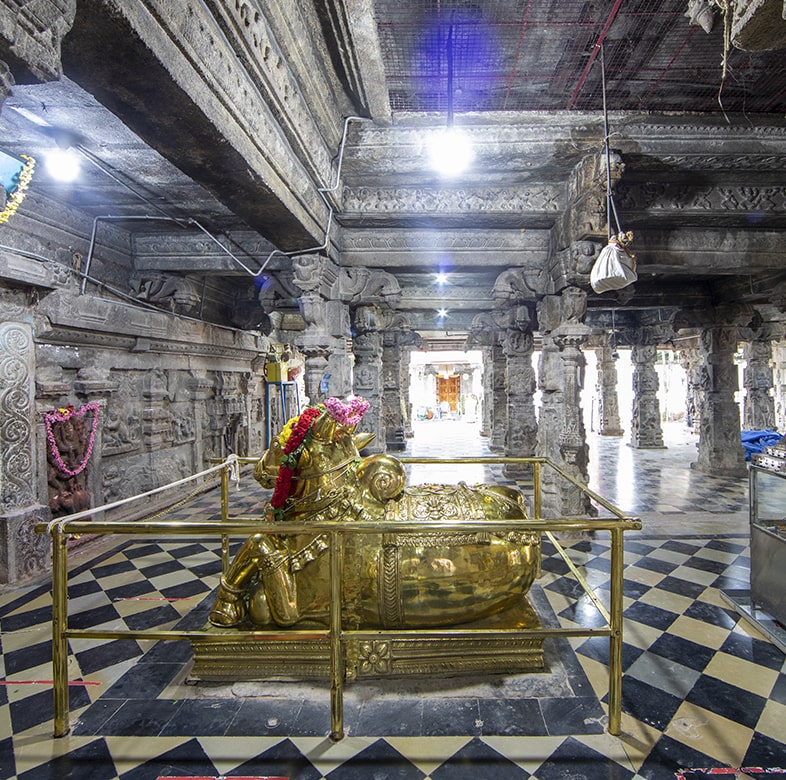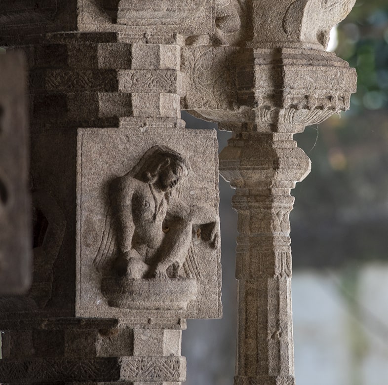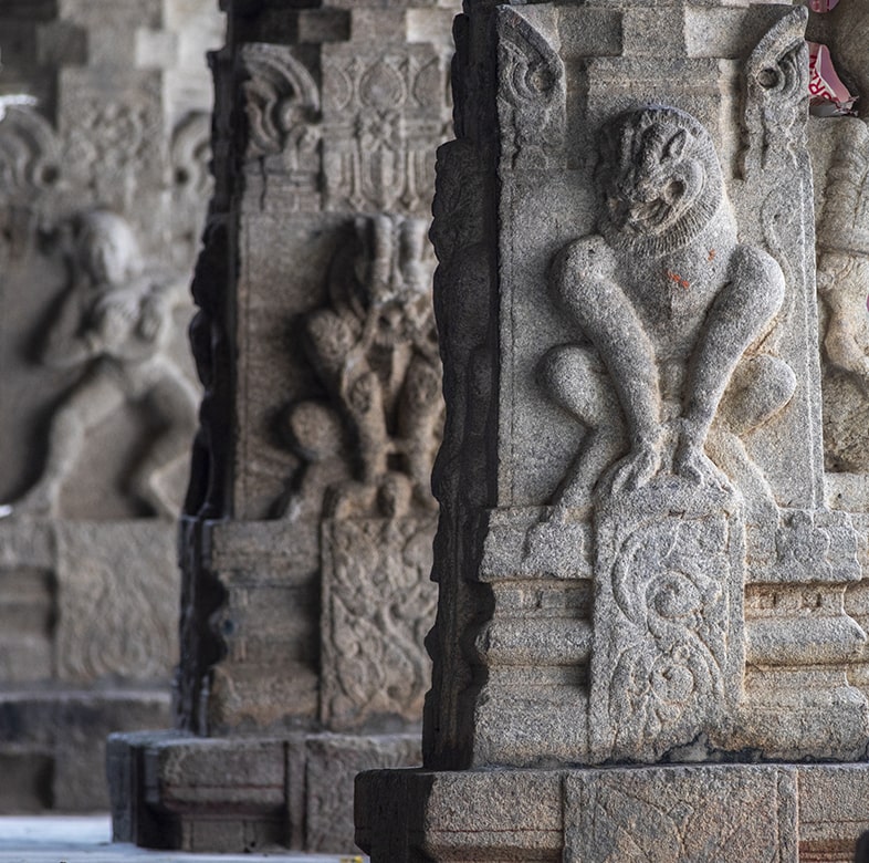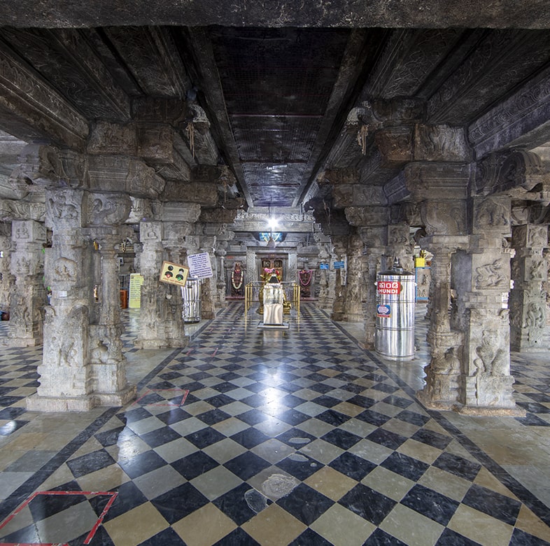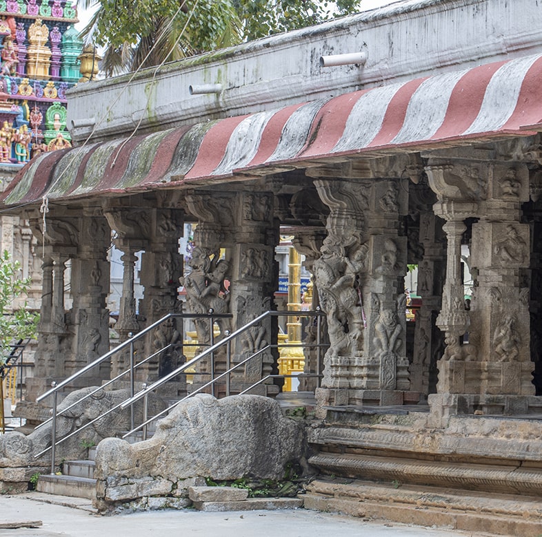 ದೇವಾಲಯದ ಮಹಾ ಮಂಟಪ ಅಥವಾ ಸ್ತಂಭದ ಸಭಾಂಗಣವು 1500 ಅಥವಾ 1600ರ ದಶಕಕ್ಕೆ ಸೇರಿದ್ದಾಗಿದ್ದು, ವಿಜಯನಗರದ ವಾಸ್ತುಶಿಲ್ಪದ ವೈಶಿಷ್ಟ್ಯಗಳಾದ ಕಂಬಸಾಲುಗಳ ಸಂಯೋಜಿತ ಕಂಬ ಅಂಕಣಗಳು ಹಾಗೂ ಕಂಬಗಳ ಮೇಲೆ, ಹಿಂಗಾಲುಗಳ ಮೇಲೆ ಎದ್ದುನಿಂತ ಹಿಂದೂ ಪುರಾಣಗಳಲ್ಲಿ ಬರುವ ಯಾಳಿಗಳೆಂಬ ಪೌರಾಣಿಕ ಜೀವಿಗಳಿಂದ ಅಲಂಕರಿಸಲ್ಪಟ್ಟಿದೆ. ಈ ಮಂಟಪವು 15 ಮೀ x 22 ಮೀ ಅಳತೆ ಹೊಂದಿದ್ದು, ಮೂರು ಬದಿಗಳಲ್ಲಿ ತೆರೆದಿದೆ. 48 ಕಂಬಗಳನ್ನು ಹೊಂದಿರುವ ಇದನ್ನು ಹಲವಾರು ಅಂಕಣಗಳಾಗಿ ವಿಂಗಡಿಸಲಾಗಿದೆ. ಪೂರ್ವ-ಪಶ್ಚಿಮ ಹಾಗೂ ಉತ್ತರ-ದಕ್ಷಿಣ ಅಕ್ಷಗಳ ಉದ್ದಕ್ಕೂ ಇರುವ ಕೇಂದ್ರ ಅಂಕಣಗಳು ವಿಶಾಲ ವ್ಯಾಪ್ತಿಯನ್ನು ಹೊಂದಿರುವ ಮೂಲಕ, ಪಡಸಾಲೆ ಹೇಗೆ ರೂಪಿಸಿವೆ ಎಂಬುದನ್ನು ಗಮನಿಸಿ. ಒಳಗಿನ ಗರ್ಭಗುಡಿಗೆ ಸೇರುವ ಮಧ್ಯ ಪಡಸಾಲೆ/ಹಜಾರವು ಕಂಬ ಅಂಕಣಗಳ ಸ್ತಂಭಗಳಿಂದ ಕೂಡಿದೆ ಮತ್ತು ಅಡ್ಡಡ್ಡ ಓಲುರಚನೆಯ, ಒಂದಕ್ಕೊಂದು ಕೂಡಿಕೊಂಡ ಕಲ್ಲಿನ ಚಪ್ಪಡಿಗಳ ವ್ಯವಸ್ಥೆಯ ಮೂಲಕ ಹೆಚ್ಚುವರಿ ಎತ್ತರವನ್ನು ಹೊಂದಿದೆ. ಈ ಹಜಾರದಲ್ಲಿನ ಫ್ರೈಜ್ಗಳನ್ನು ನರ್ತಕರ ಸಂಕೀರ್ಣ ವ್ಯಕ್ತಿಗಳಿಂದ ಅಲಂಕರಿಸಲಾಗಿದೆ. ನರ್ತಕಿಯರ ಸೂಕ್ಷ್ಮ ಕೆತ್ತನೆಯನ್ನು ಹೊಂದಿದ ಅಲಂಕರಣಪಟ್ಟಿಗಳಿಂದ ಈ ಪಡಸಾಲೆ/ಹಜಾರವು ಅಲಂಕೃತವಾಗಿದೆ. ದಿಡ್ಡಿಗೋಡೆ ಇರುವ ಅಧಿಷ್ಠಾನ, ಕಂಬ ಹಾಗೂ ಛಾದ್ಯವನ್ನು ಮಂಟಪದ ಮೂಲಕ ಕಾಣುವ ಕಟ್ಟಡ ನಿರ್ಮಾಣ ವಿಭಾಗವು ತೋರಿಸುತ್ತದೆ.