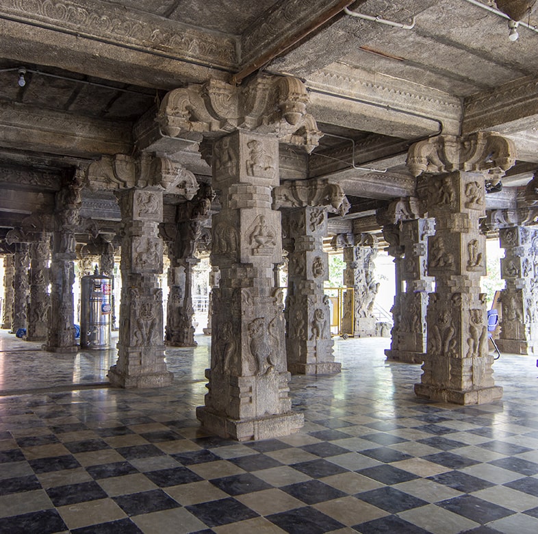 ಮಹಾ ಮಂಟಪವು ಸೂಕ್ಷ್ಮವಾದ ಕೆತ್ತನೆಗಳು/ಸೊಗಸಾದ ಕೆತ್ತನೆಗಳು ಮತ್ತು ಅಲಂಕಾರಗಳಿಂದ ತುಂಬಿದ್ದು, ಇದು ವಿಶೇಷವಾಗಿ 48 ಕಂಬಗಳ ಮೇಲೆ ಗೋಚರಿಸುತ್ತದೆ. ಈ ಸ್ತಂಭಗಳನ್ನು ಅವುಗಳ ಸಂರಚನೆಗೆ ಅನುಗುಣವಾಗಿ ವಿವಿಧ ಸಂಕೇತಗಳಾಗಿ ವರ್ಗೀಕರಿಸಬಹುದು. ಪ್ರಮಾಣಿತ ಸ್ತಂಭವು ಬಹುಭುಜಾಕೃತಿಯ ದಿಂಡು ಆಗಿದ್ದು, ಮೂರು ಚದರ ವಿಭಾಗಳಾಗಿ ವಿಭಜಿಸಲ್ಪಟ್ಟಿದ್ದು, ಪ್ರತಿಯೊಂದೂ ದೇವರುಗಳು, ಪ್ರಾಣಿಗಳು, ಆಕಾಶಗಳು ಮತ್ತು ಸಾಮಾನ್ಯ ಜನರ ಶಿಲ್ಪಗಳಿಂದಲೂ ಸಮೃದ್ಧವಾಗಿ ಕೆತ್ತಲಾಗಿದೆ. ಕೇಂದ್ರ ಅಂಕಣಗಳ ಹಾಗೂ ಪರಿಧಿಯ ಉದ್ದಕ್ಕೂ, ಸ್ಥಂಭಗಳಲ್ಲಿ ತೆಳ್ಳಗಿನ ಕೊಲೊನೆಟ್ /ಕಂಭವನ್ನು ಪರಿಚಯಿಸಲಾಗಿದೆ. ಈ ಕೊಲೊನೆಟ್‌ಗಳು ಸ್ತಂಭದ ವ್ಯಾಪ್ತಿಯನ್ನು ವಿಸ್ತರಿಸುವ ಮತ್ತು ಆಳವಾದ ಮುಂಚಾಚಿಗೆ ಅನುವು ಮಾಡಿಕೊಡುವ ಎರಡೂ ಉದ್ದೇಶವನ್ನು ಪೂರೈಸುತ್ತವೆ. ವಿಶೇಷವಾಗಿ ಕೇಂದ್ರ ಅಂಕಣದಲ್ಲಿ, ಕಾಣುವ ಒಟ್ಟಾರೆ ನೋಟವನ್ನು ಕೊಲೊನೆಟ್‌ಗಳು ತೆಳ್ಳಗೆ ಇಡುತ್ತವೆ, ಹಾಗಾಗಿ ಲಘುತ್ವದ ಭಾವಕ್ಕೆ ತನ್ನ ಕೊಡುಗೆಯನ್ನು ನೀಡುತ್ತವೆ. ತನ್ನ ಪೂರ್ವ ದ್ವಾರದ ಕಡೆಗೆ ಮಂಟಪ ಚಾಚಿಕೊಂಡಿರುವ ಕಡೆಯಲ್ಲಿ ಕೋನಾಕಾರದ ಕಲೋನೆಟ್ ಹೊಂದಿರುವ ಕಂಬವು ಇದೆ. ಮೂರು ಪ್ರವೇಶ ಮೆಟ್ಟಿಲುಗಳ ಇಕ್ಕೆಲೆಗಳಲ್ಲಿ ಯಾಳಿಗಳನ್ನು ಹೊಂದಿರುವ ಕಂಬಗಳು ಇವೆ.