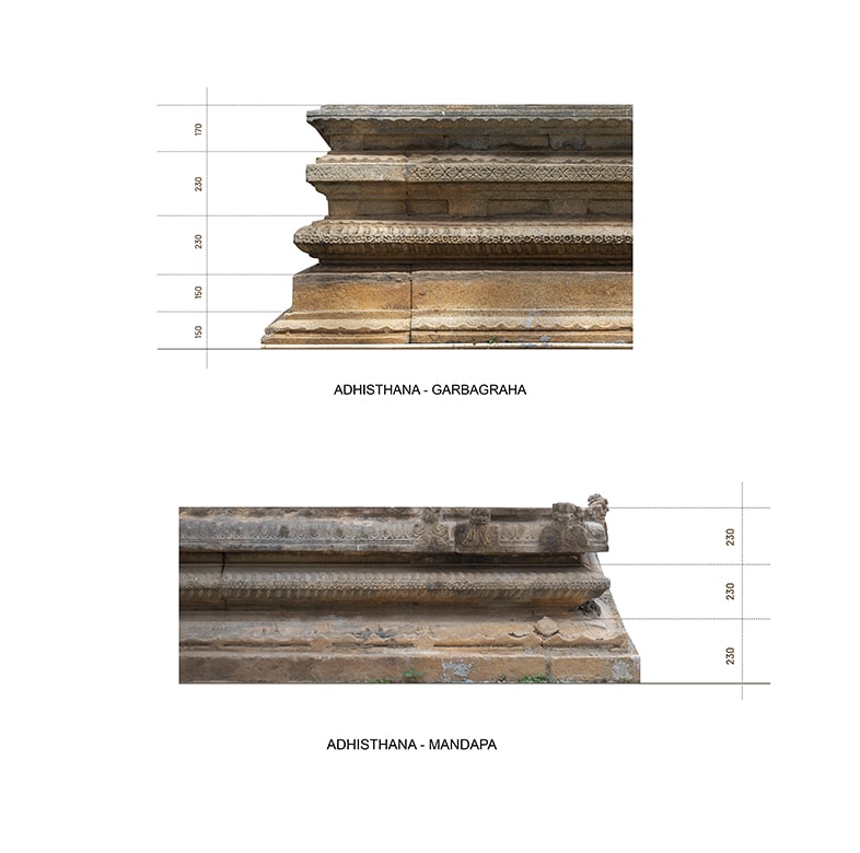 ಪಡ (ಗೋಡೆಗಳು) ಹಾಗೂ ಮೇರುರಚನೆಯ ಇತರ ಅಂಶಗಳು ದೇಗುಲದ ಅಧಿಷ್ಠಾನ, ಅಂದರೆ ಅದರ ತಳ ಅಥವಾ ಮೇಲುಪಾಯ/ಪಿಂಜಿಯ ಮೇಲೆ ನಿಂತಿವೆ ಅಡಿಪಾಯವು ಸಾಮಾನ್ಯವಾಗಿ ಹಲವಾರು ಕಾರಣೆ/ಬಾಹ್ಯರೇಖಾಲಂಕಾರಗಳನ್ನು ಒಳಗೊಂಡಿರುತ್ತದೆ (ಕೆಳದಿಂದ ಮೇಲಕ್ಕೆ): ಉಪಾನ ಅಥವಾ ಸುಬತಳ, ಪದ್ಮ (ಕಮಲ ವಿನ್ಯಾಸದ ಪದರ), ಜಗತಿ (ನೇರ ಮತ್ತು ಸರಳ ಅಲಂಕೃತ), ಕುಮುದ (ಸುತ್ತಿನ ಹಾಗೂ ಅಡ್ಡಪಟ್ಟಿ), ಕಂಠ ಮತ್ತು ಕಪೋಲಪಾಲಿಕಾ. (ಕಮಲ ದಳಗಳ ಎರಡು ಪದರ) ಈ ಪದರಗಳು ಸೋಮೇಶ್ವರ ದೇವಾಲಯದ ಮಹಾಮಂಟಪದ ಅಧಿಷ್ಠಾನದಲ್ಲಿ ಕಂಡುಬರುತ್ತವೆ. ಅಧಿಷ್ಠಾನದ ಸಾಲಿನಲ್ಲಿ ಇರುವ ಗರ್ಭಗೃಹವು ಹೆಚ್ಚಿನ ಪದರಗಳೊಂದಿಗೆ ವಿನ್ಯಾಸದಲ್ಲಿ ವ್ಯತ್ಯಾಸ ಕಂಡುಬರುತ್ತದೆ.