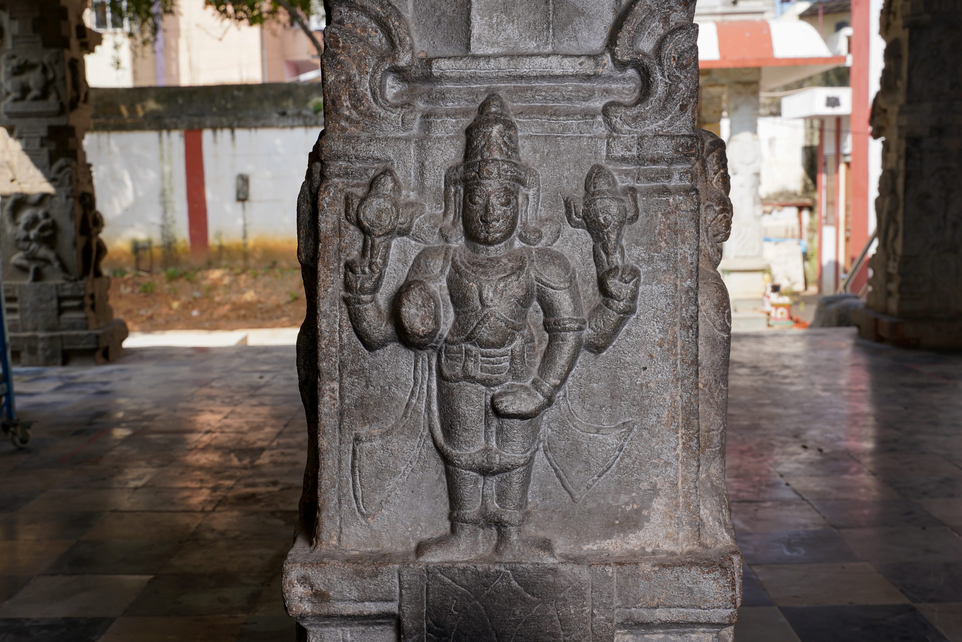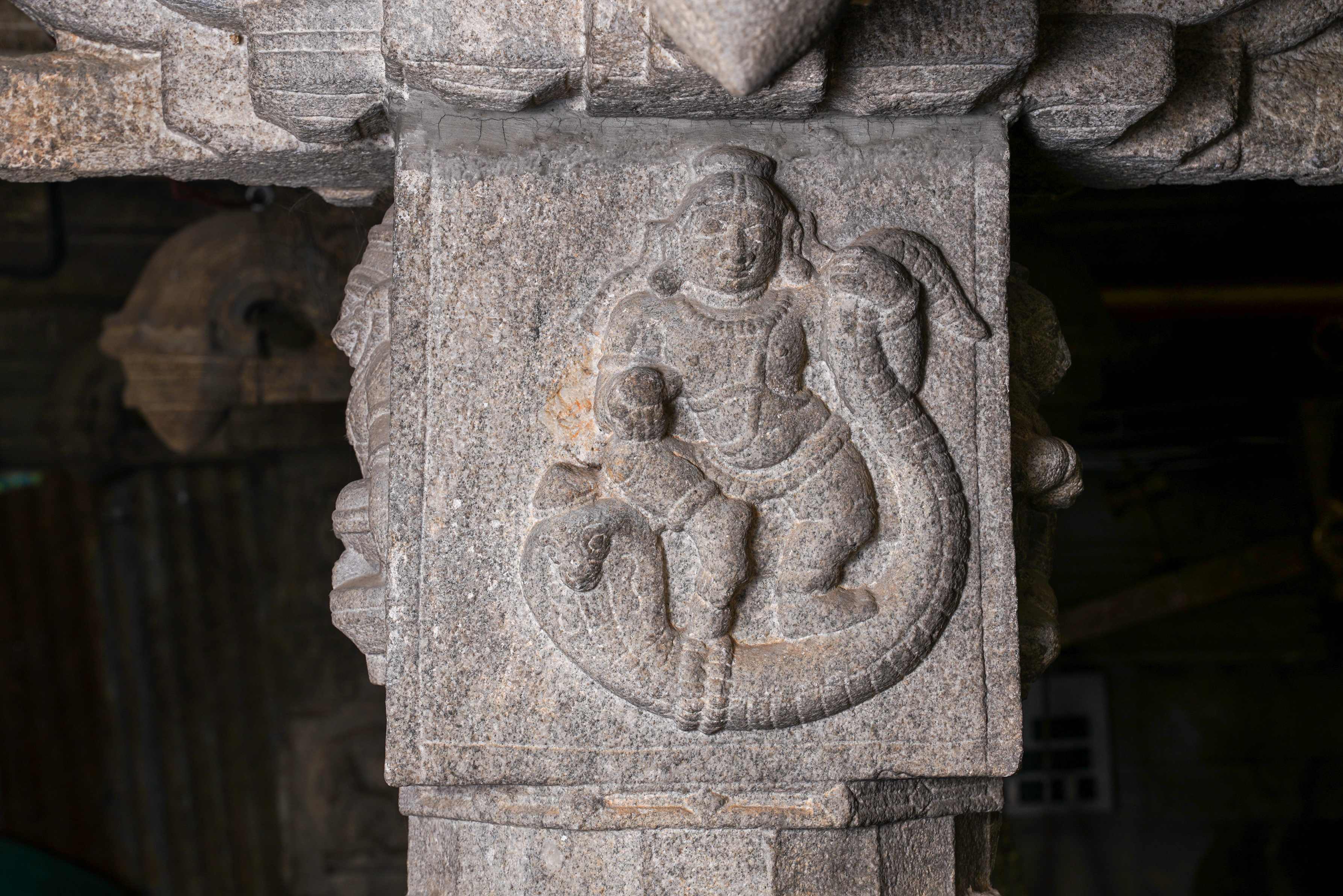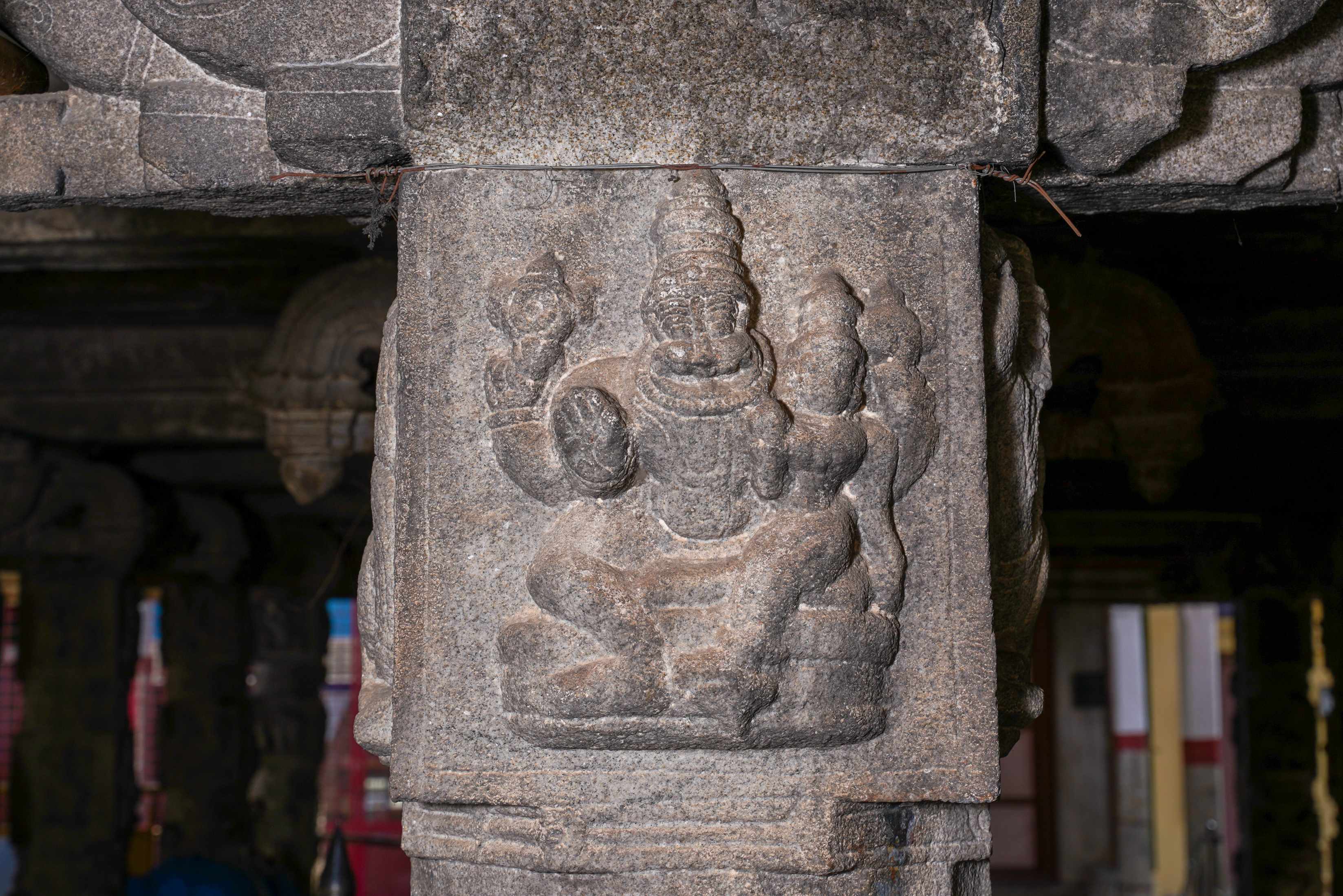 A stone linga and a graceful stone icon of Kamakshi behind a consecrated Srichakra occupy the two main shrines of the temple complex. The temple has numerous subshrines with subsidiary deities, lingas, a Hanuman and a Navagraha group. A small, gleaming collection of bronze processional deities and brass kavachas are stored in a room bedside the sanctum, to be taken out for festivals. Relief sculptures of Siva, Parvati, Vishnu, Lakshmi and Ganesha in various manifestations adorn the mandapa pillars, walls, gopura and vimanas of the temple. Siva manifests as the dancing Nataraja, the furious Virabhadra, the mystical Mrityunjaya, and the charming married Umasahita. Baby Krishna is a favourite among the sculptors who depict him stealing butter, wrestling the snake Kaliya and lifting the mount Govardhana.