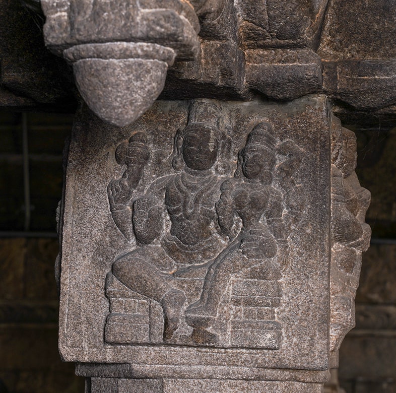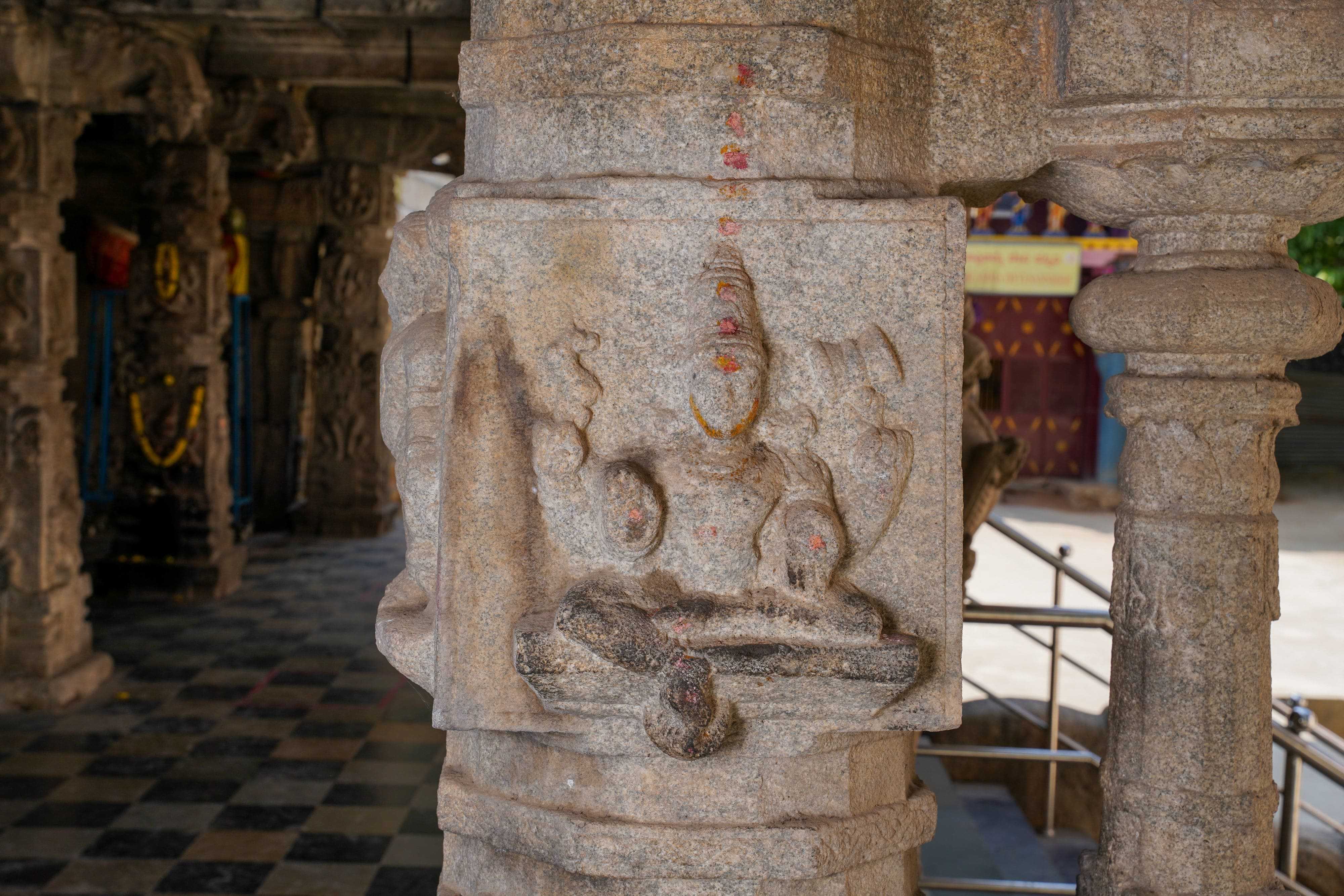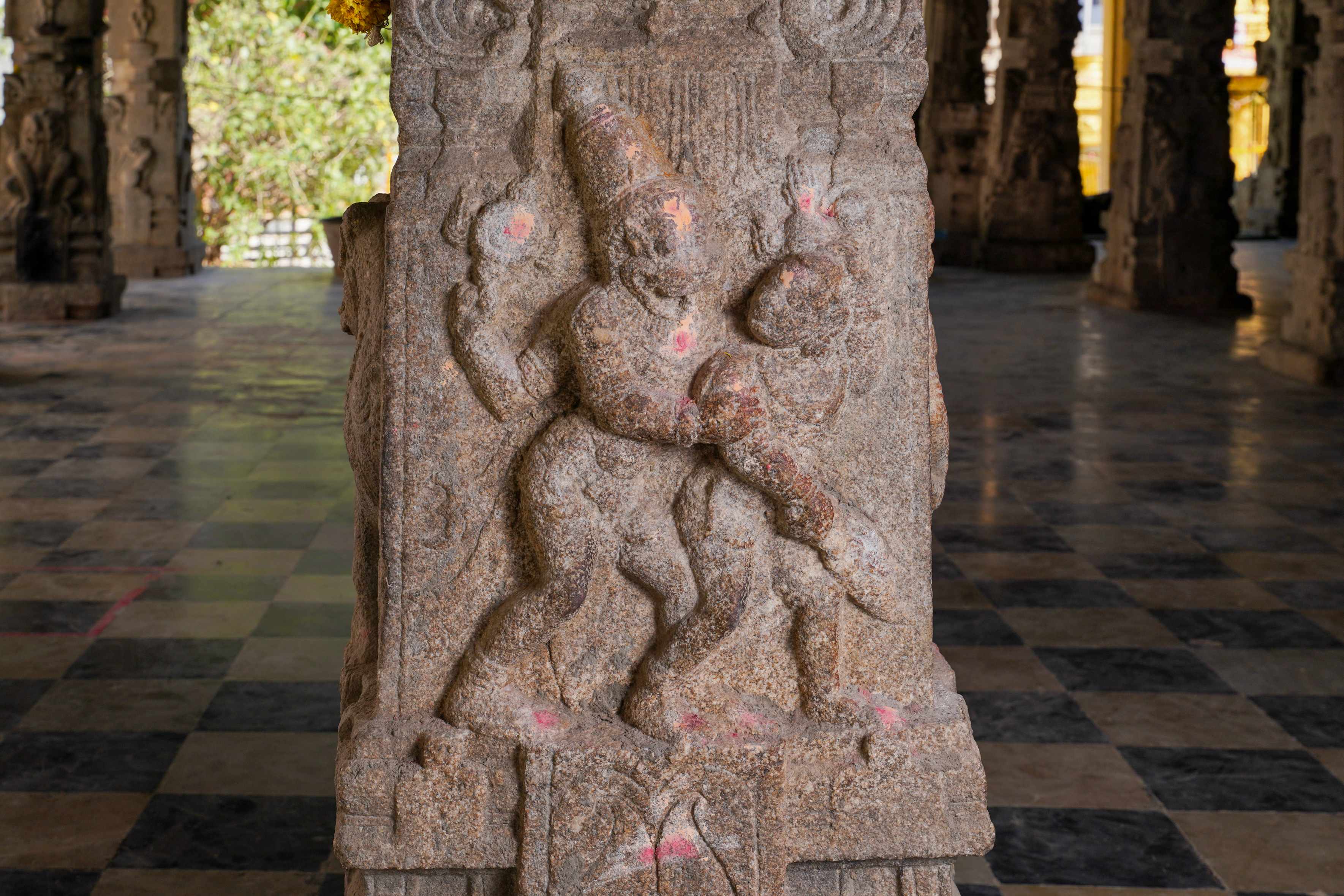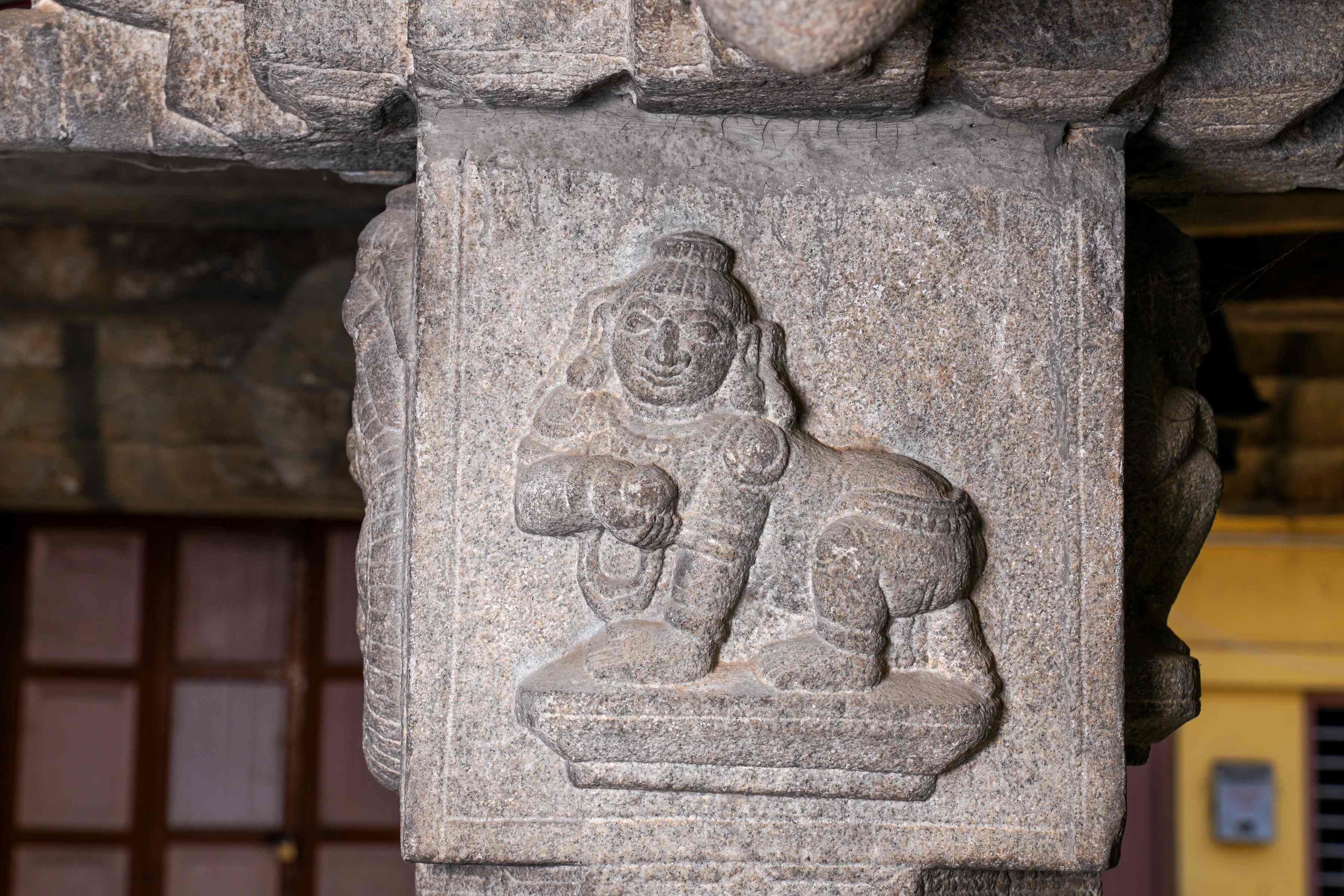 A stone linga and a graceful stone icon of Kamakshi behind a consecrated Srichakra occupy the two main shrines of the temple complex. The temple has numerous subshrines with subsidiary deities, lingas, a Hanuman and a Navagraha group. A small, gleaming collection of bronze processional deities and brass kavachas are stored in a room bedside the sanctum, to be taken out for festivals. Relief sculptures of Siva, Parvati, Vishnu, Lakshmi and Ganesha in various manifestations adorn the mandapa pillars, walls, gopura and vimanas of the temple. Siva manifests as the dancing Nataraja, the furious Virabhadra, the mystical Mrityunjaya, and the charming married Umasahita. Baby Krishna is a favourite among the sculptors who depict him stealing butter, wrestling the snake Kaliya and lifting the mount Govardhana.