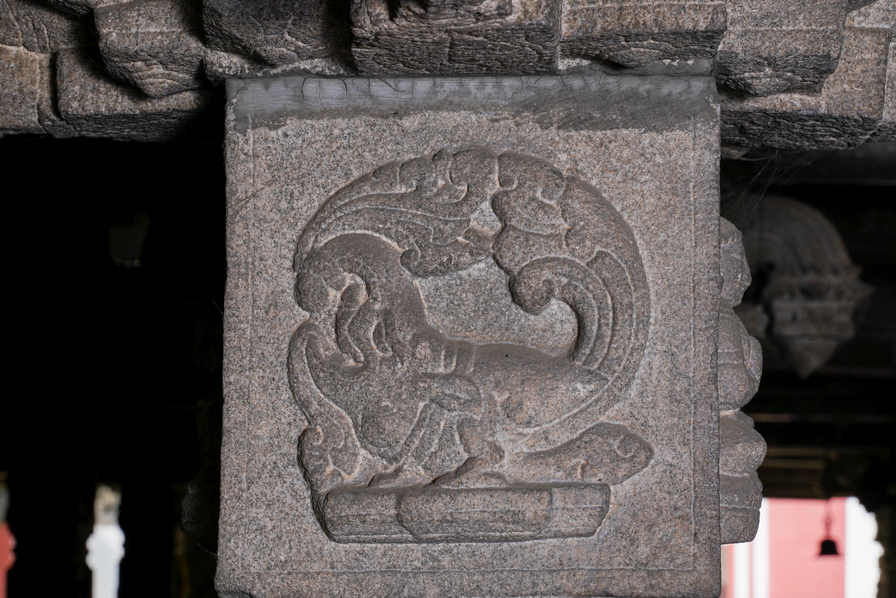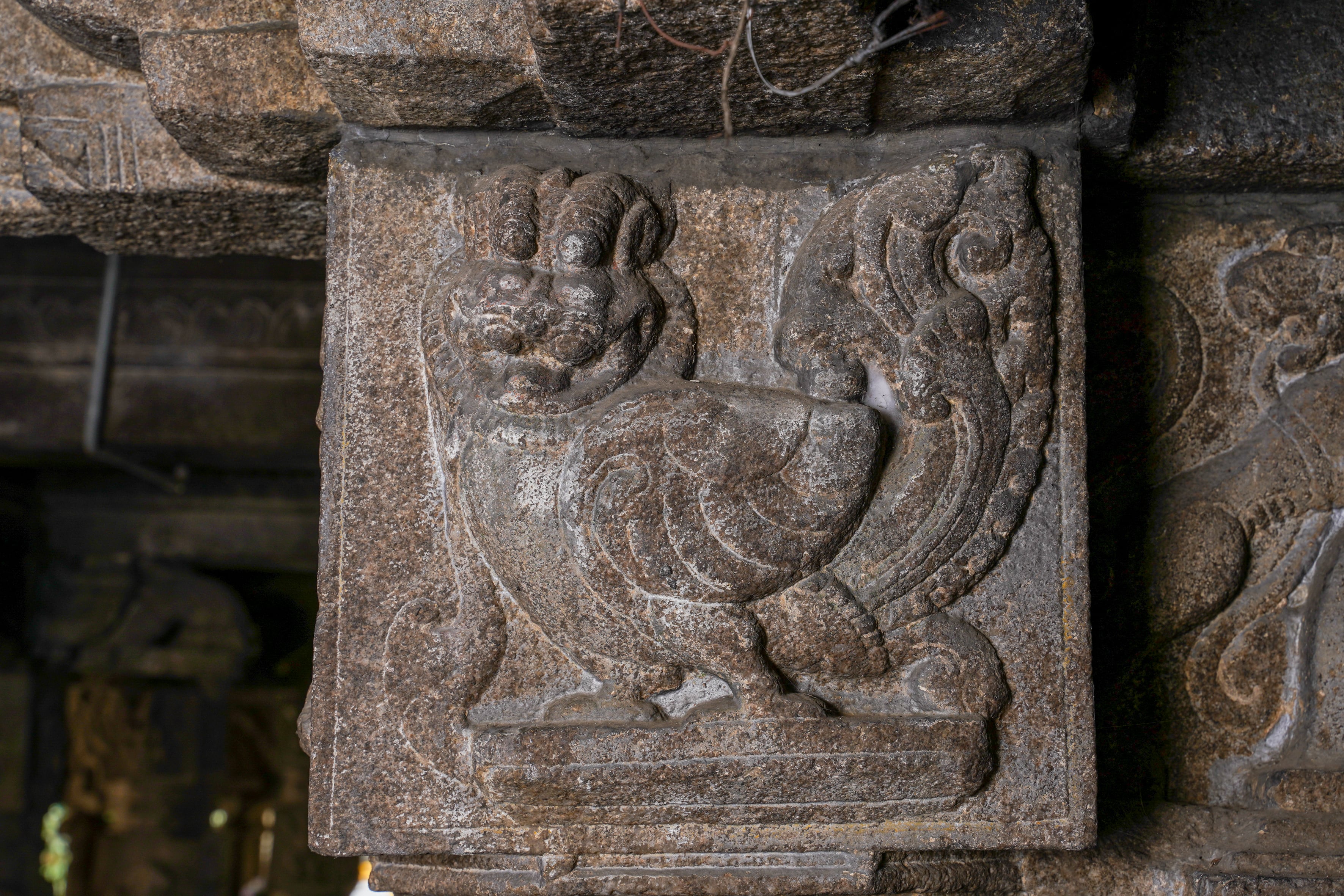 Mythical creatures that combine the features of two or more different animals are found in all ancient cultures of the world. Numerous hybrid creatures, called ihamrga, yali, vyala, vidala, are carved on the walls and pillars of the temple. A florid makara, a goose with three heads, a creature with a lion face and the body of a bird, a human face-bird body combination, a cobra-headed bird, cow and camel headed birds, a creature that looks more like a manatee-bird than an elephant bird. These creatures add a delightful, playful sense of unpredictability to the sculptures in the temple.